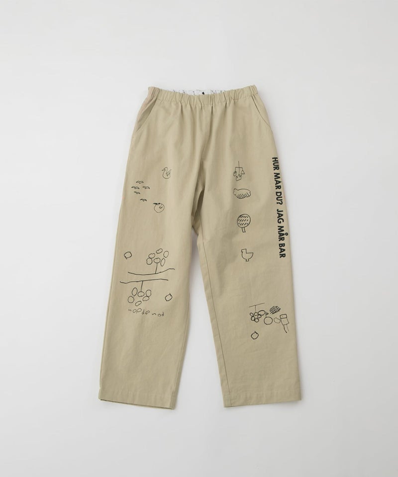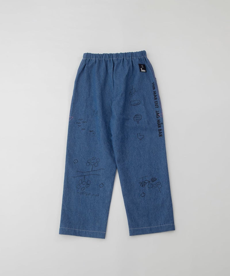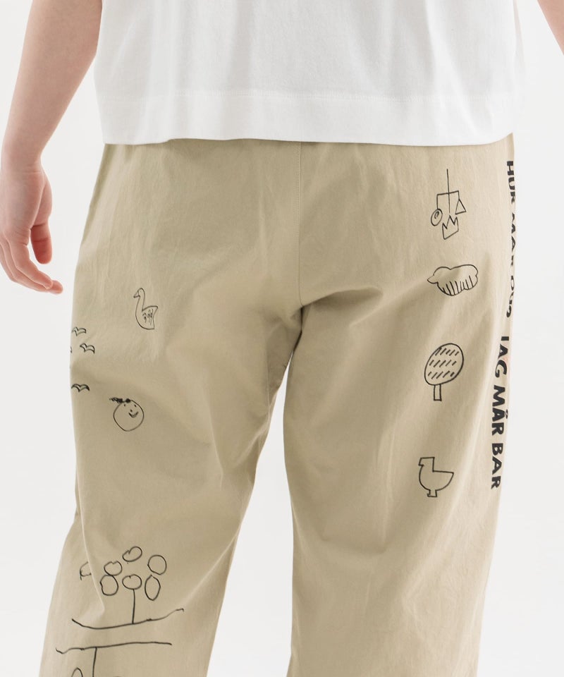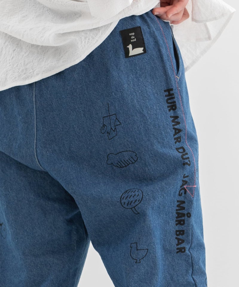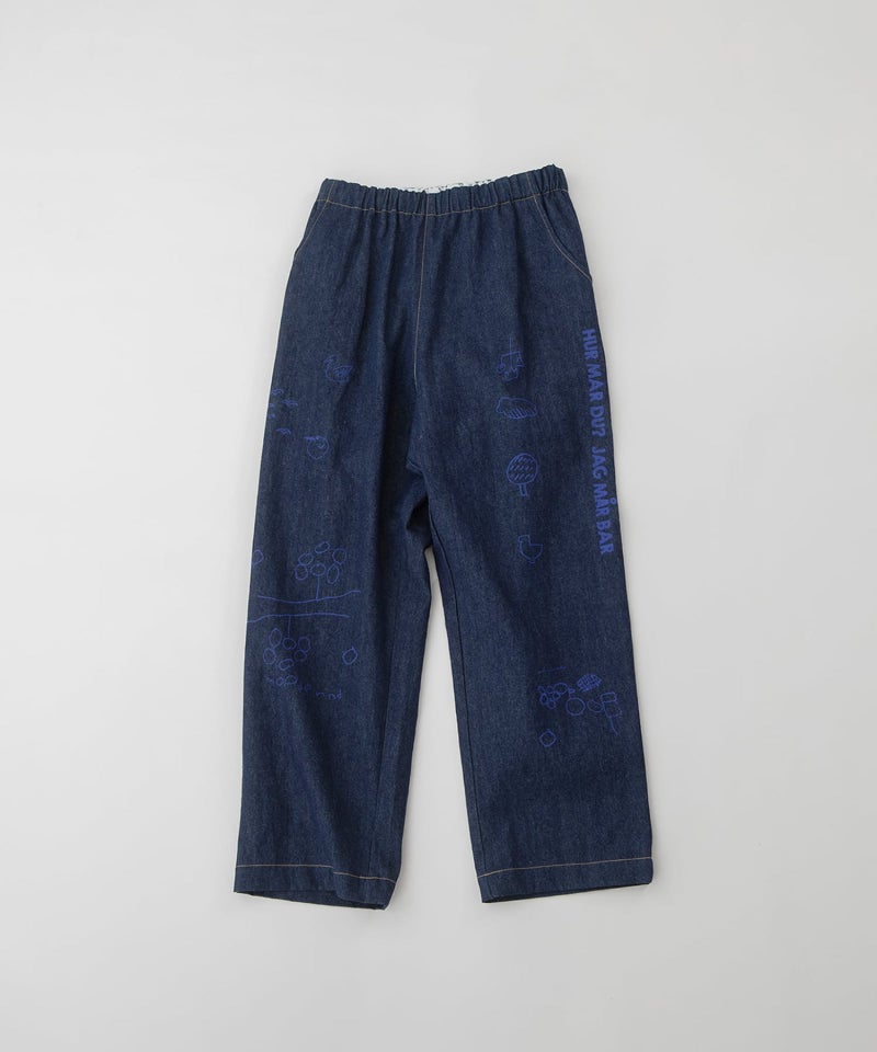 落書きのようなラフなモチーフをプリントしたパンツ。リラックスしたシルエットのジャストなフルレングス丈のストレートパンツで、高密度の程よく軽いコットンツイルと麻混のしっかりめのデニムを使用しています。右後ろのスワンネームやサイドの配色三角ステッチなどもさりげないアクセントを効かせています。ウエストゴム仕様で内紐つき、ウエスト裏の見返しと両サイドポケットの袋布はオリジナルのロゴプリント生地です。