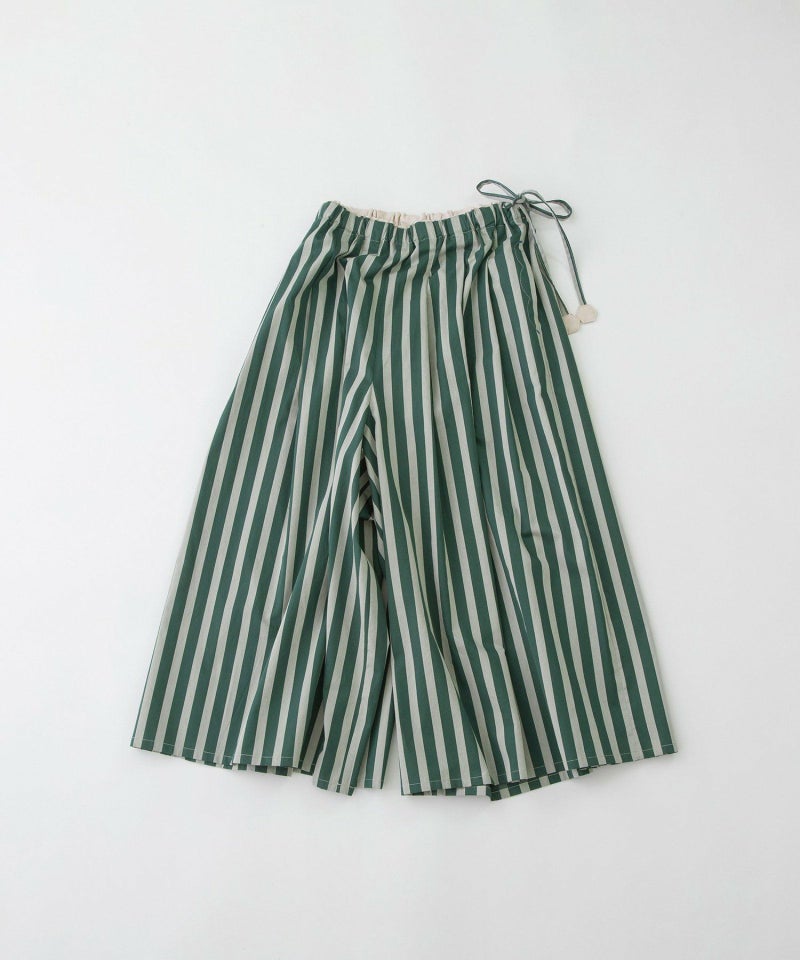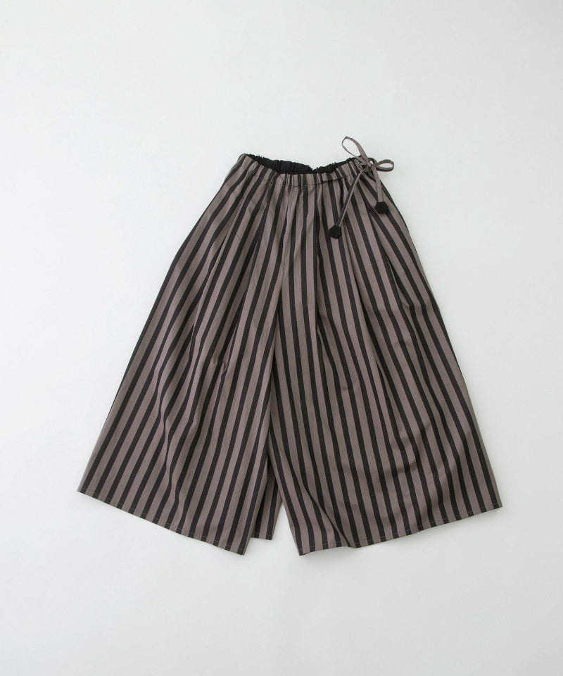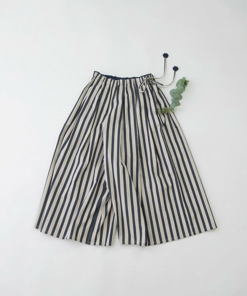 ・ビンテージメンズシャツ風のきれいな目面で、しっかり厚みのあるコットンサテンのキュロット。オリジナルのストライプ生地で、スカート見えしながら活動しやすい人気のタイプです。