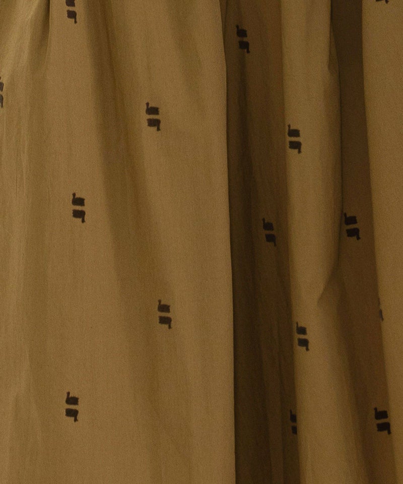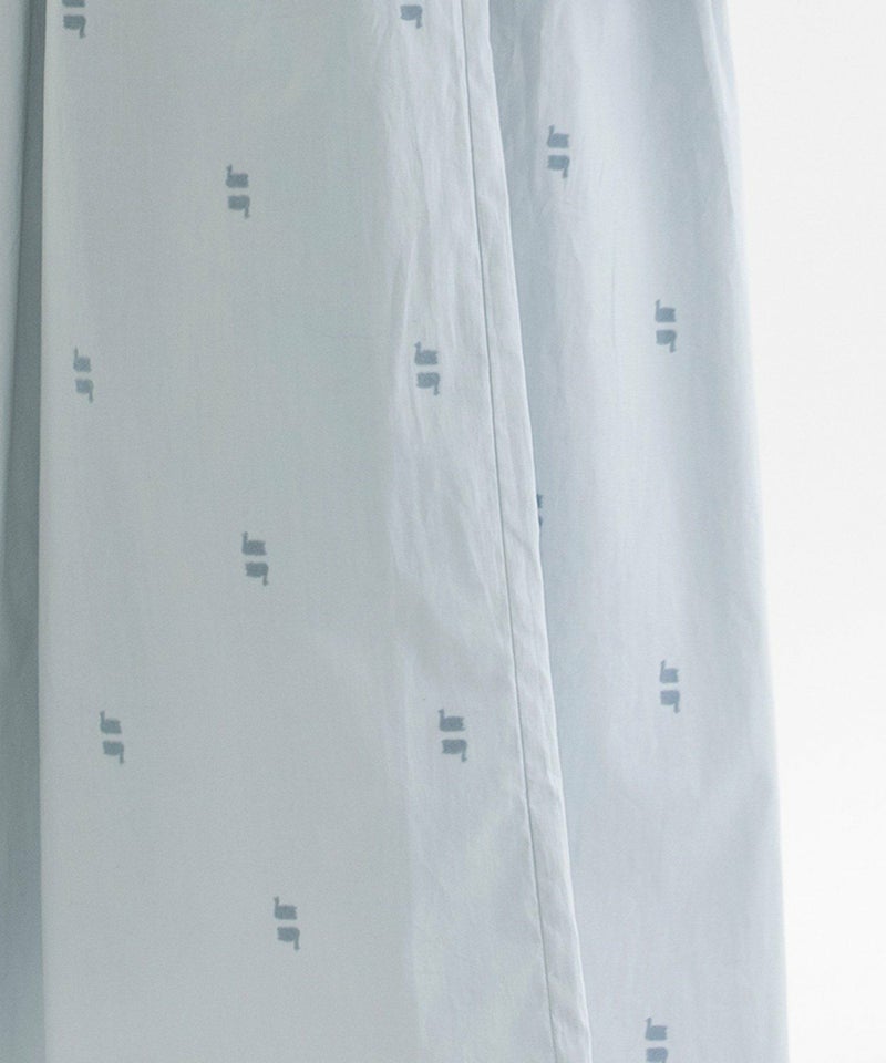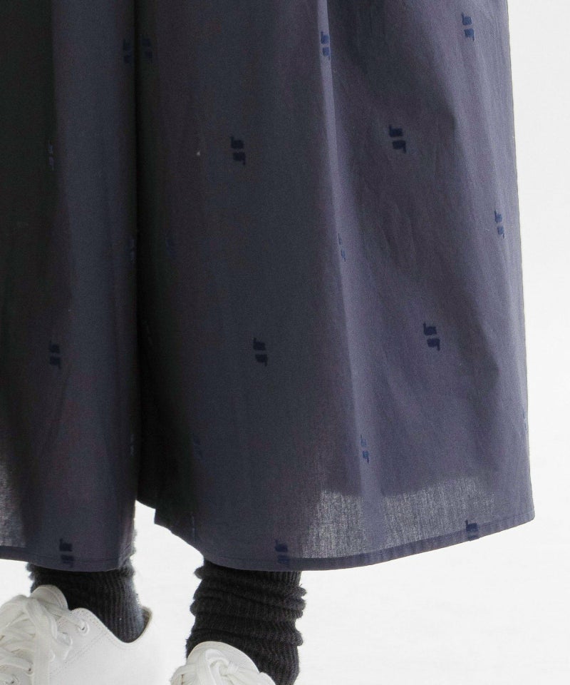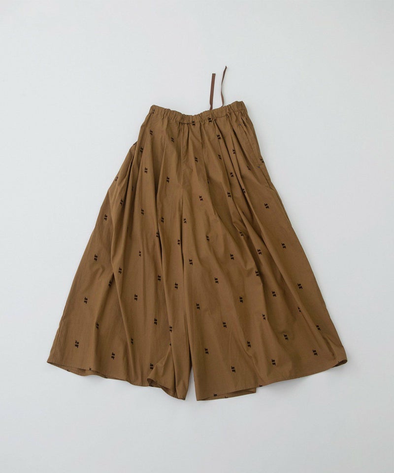 やわらかなブロード素材に温かみのあるフロッキープリントを施したオリジナル生地のキュロット。スワンが水面に映ったように上下に並んだ、繊細で印象的な柄が目を惹きます。スカート見えしながら活動しやすい人気のキュロット。しっかり長めの着丈に、ウエストはゴム仕様でリラックスした履き心地です。両サイドのポケット口にはスカラップステッチが入っています。