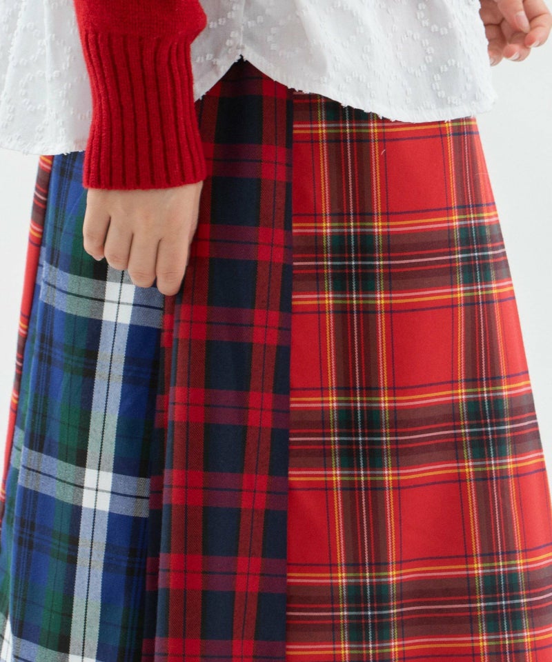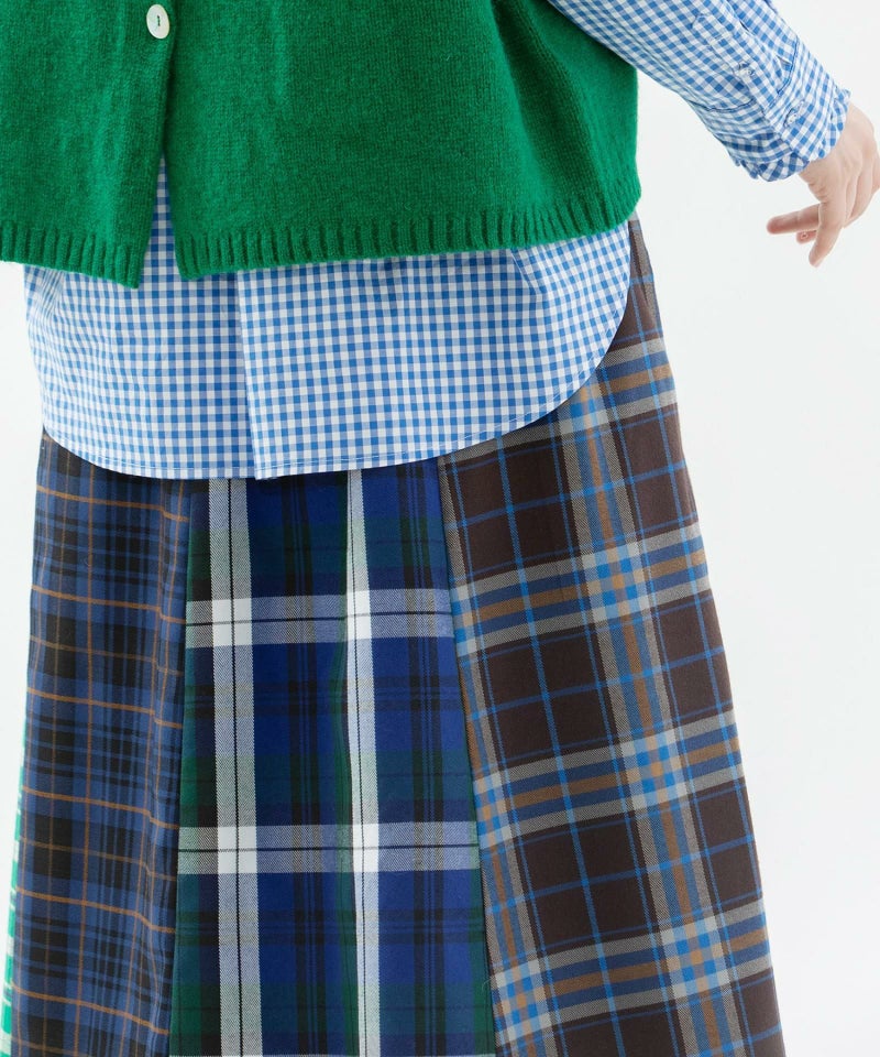 4種類のチェックを組み合わせたスカート。6枚はぎのフレアスカートで、どこを前にしても履いて頂けます。ポリエステルレーヨンで扱いやすい生地を使いました。カジュアルにもきれいめにも着用できて、ニットにもスウェットにも合わせやすいアイテムです。ウエストはゴム仕様で内紐つき。両サイドポケットあり。