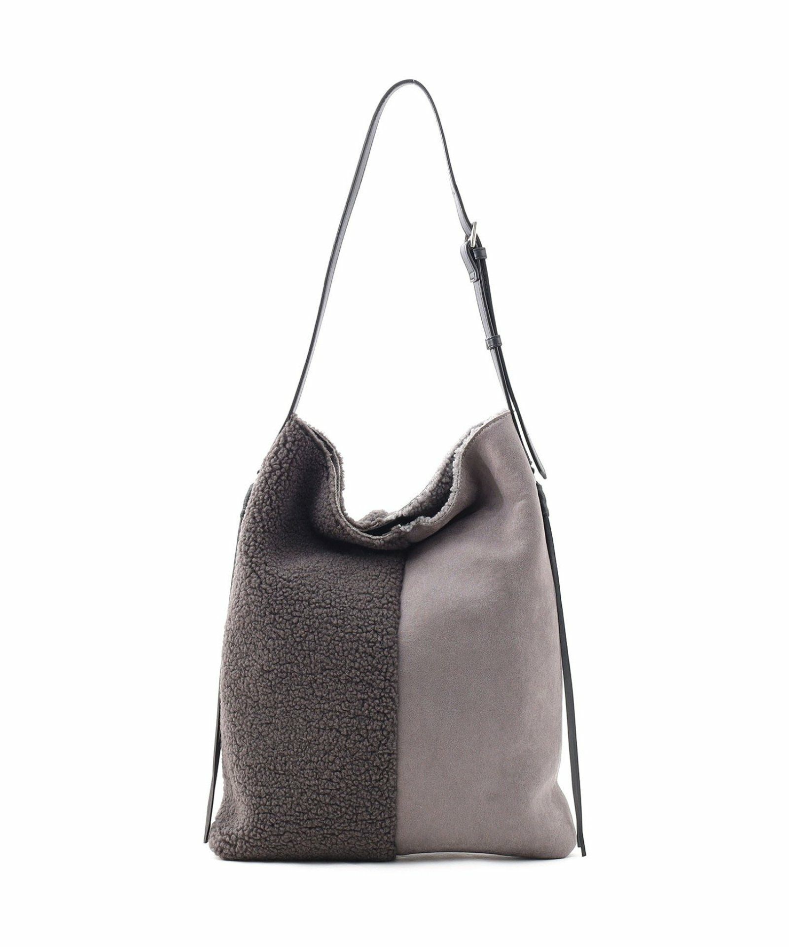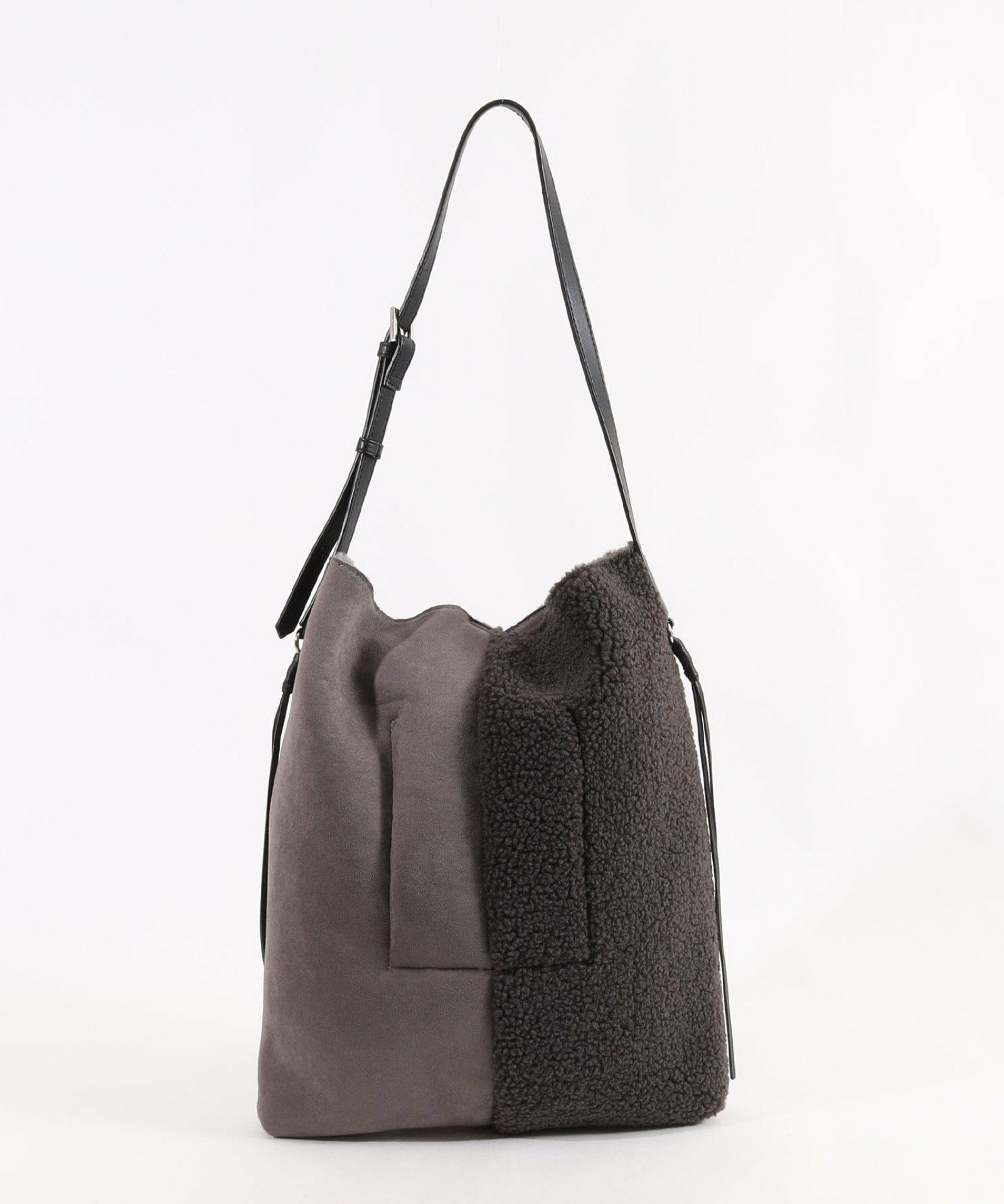 シンプルながらもバイカラーデザインが特徴のムートン風ショルダーバッグです。