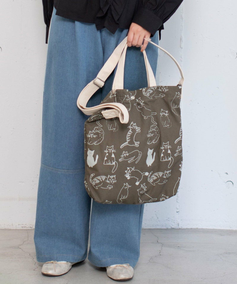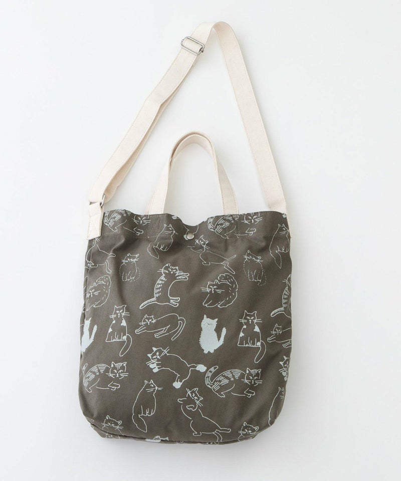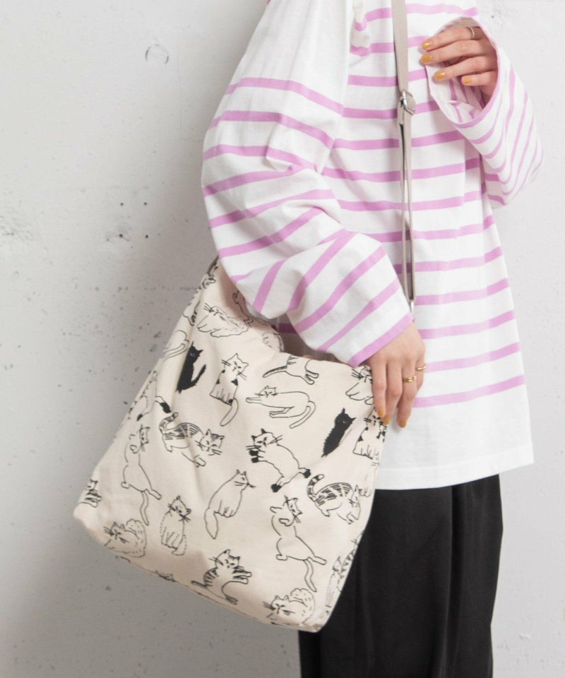 オリジナルのcat’sプリントが目を惹くショルダーバッグ。A4もすっぽり入るサイズ感です。手持ちと肩掛け・斜めがけの2wayで使えます。内側には細々したものを入れられるポケット付き。クタッとしたネコの表情が、なんとも愛着の湧くバッグです。※プリントの出方には個体差があります。
