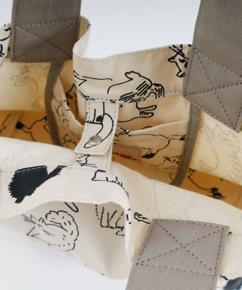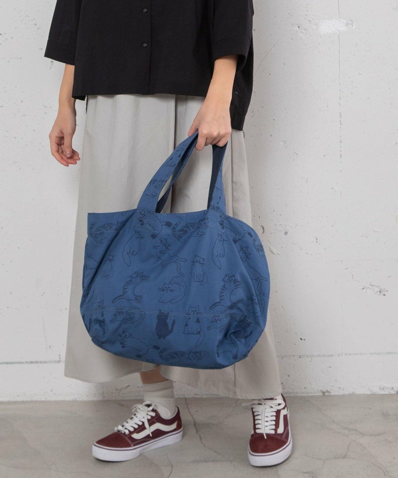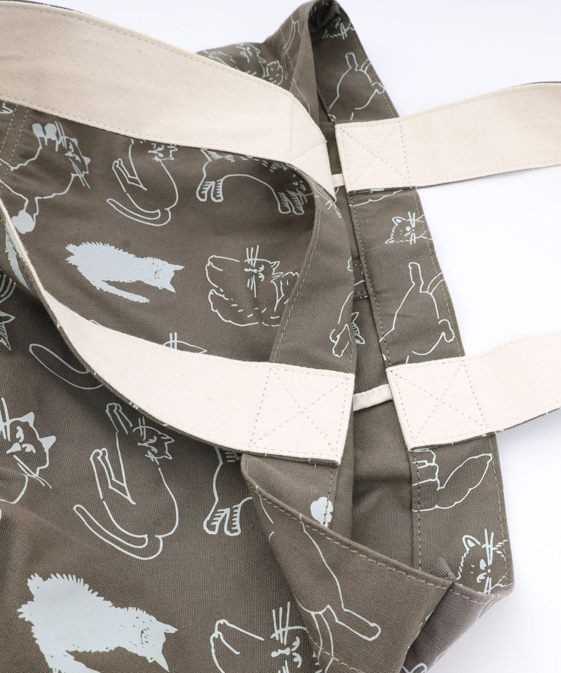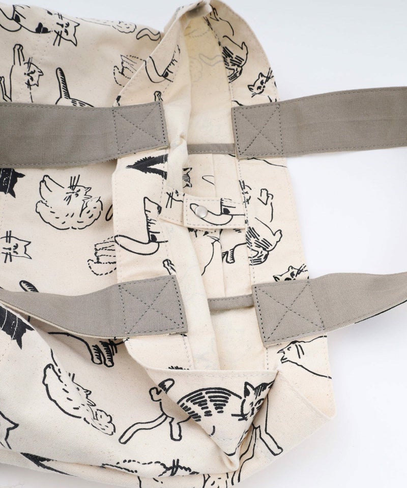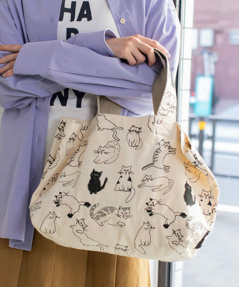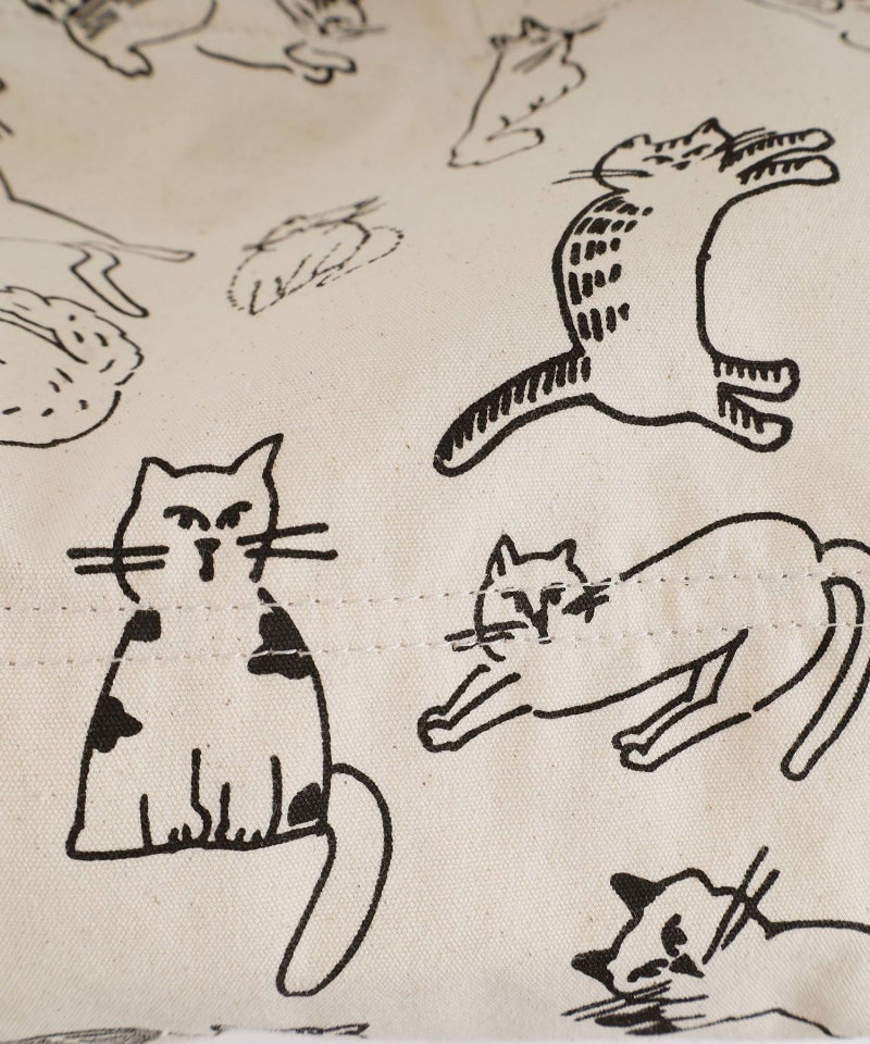 オリジナルのcat’sプリントが目を惹くトート。A4もすっぽり入るサイズ感です。開け口にはスナップボタンが付いています。内側には細々したものを入れられるポケット付き。クタッとした表情が、なんとも愛着の湧くバッグです。※プリントの出方には個体差があります。