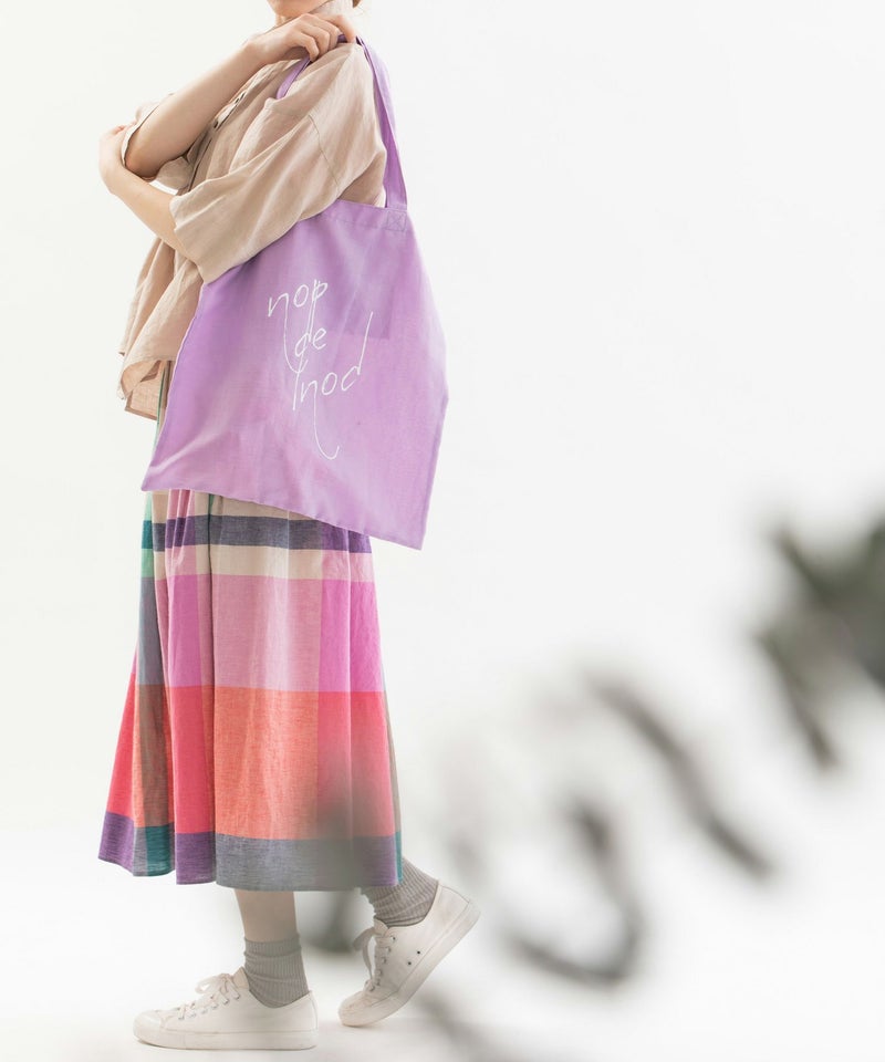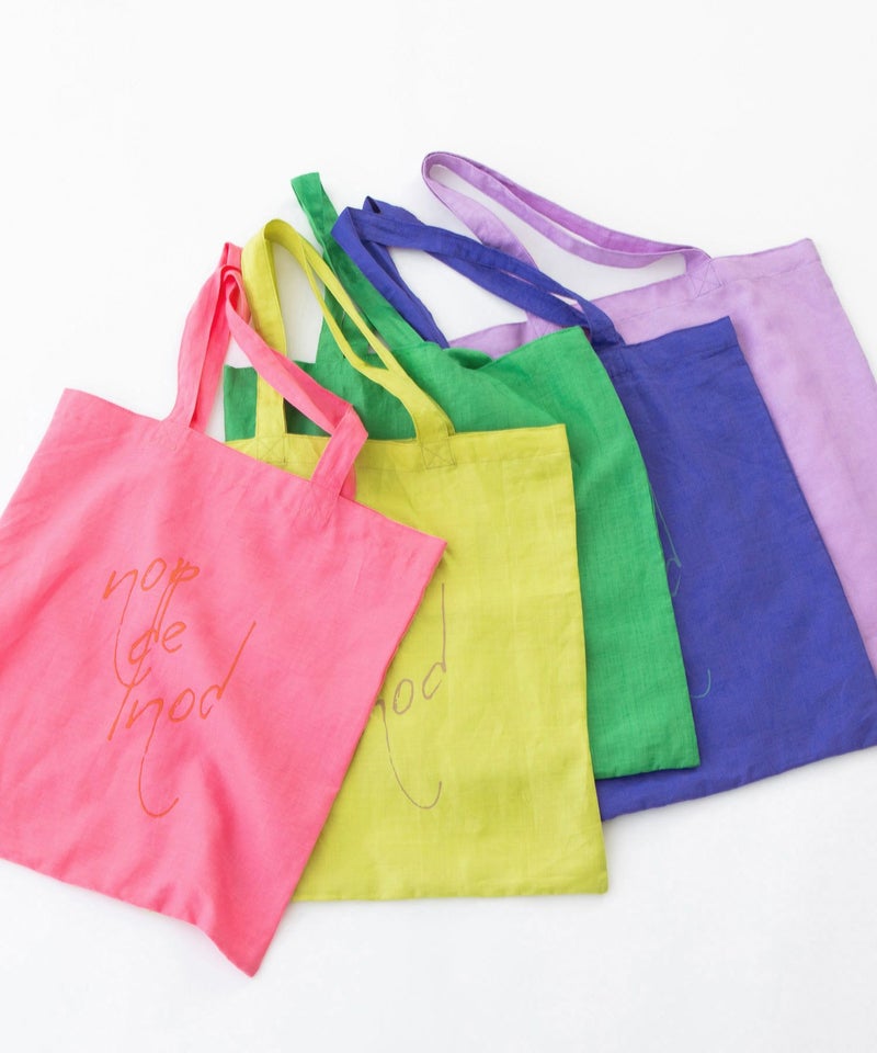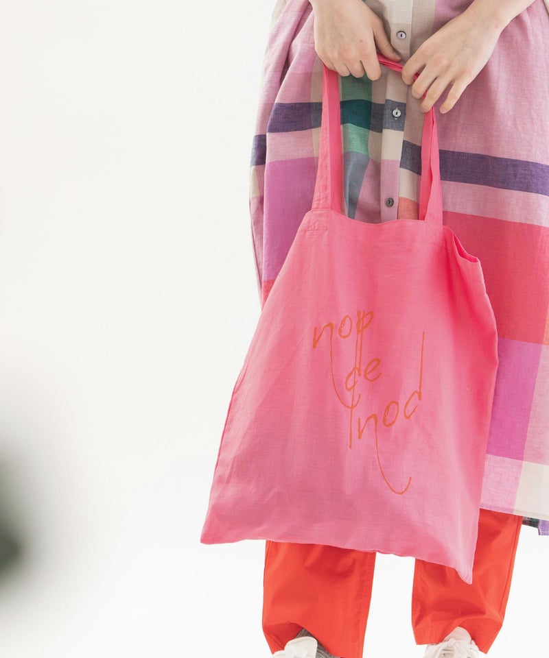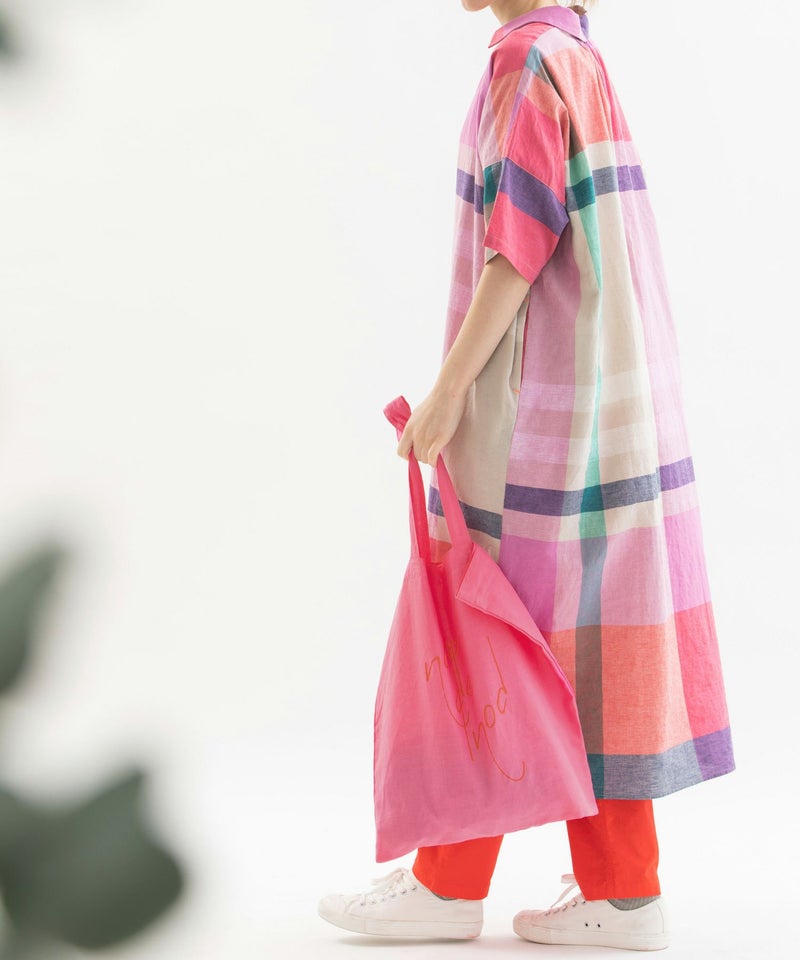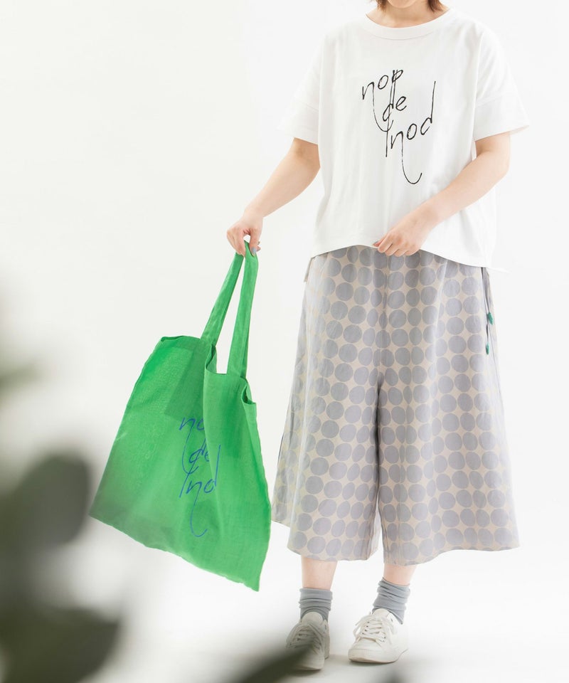 ラミー麻混の発色が良い軽い生地を使った、5色のカラフルなカラー展開です。Tシャツとお揃いの書き文字ロゴプリント入り。