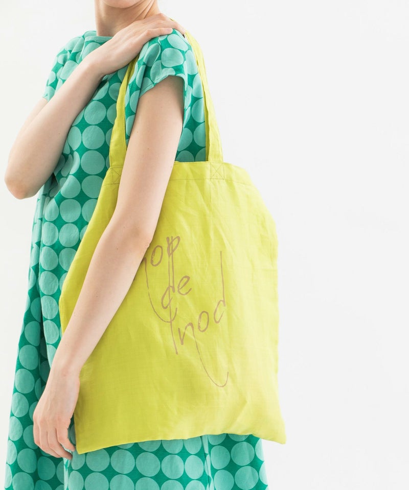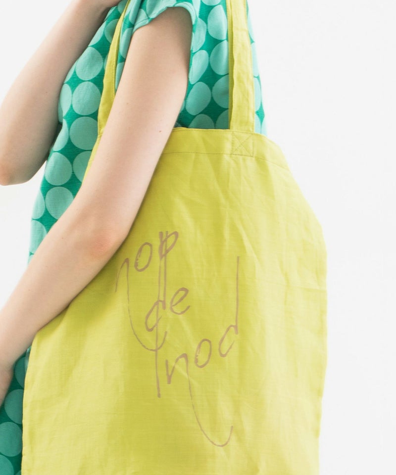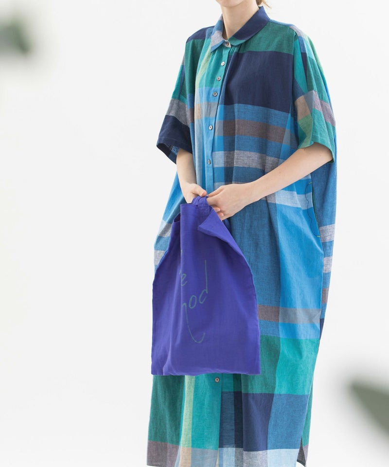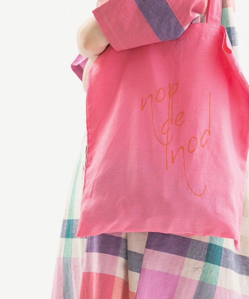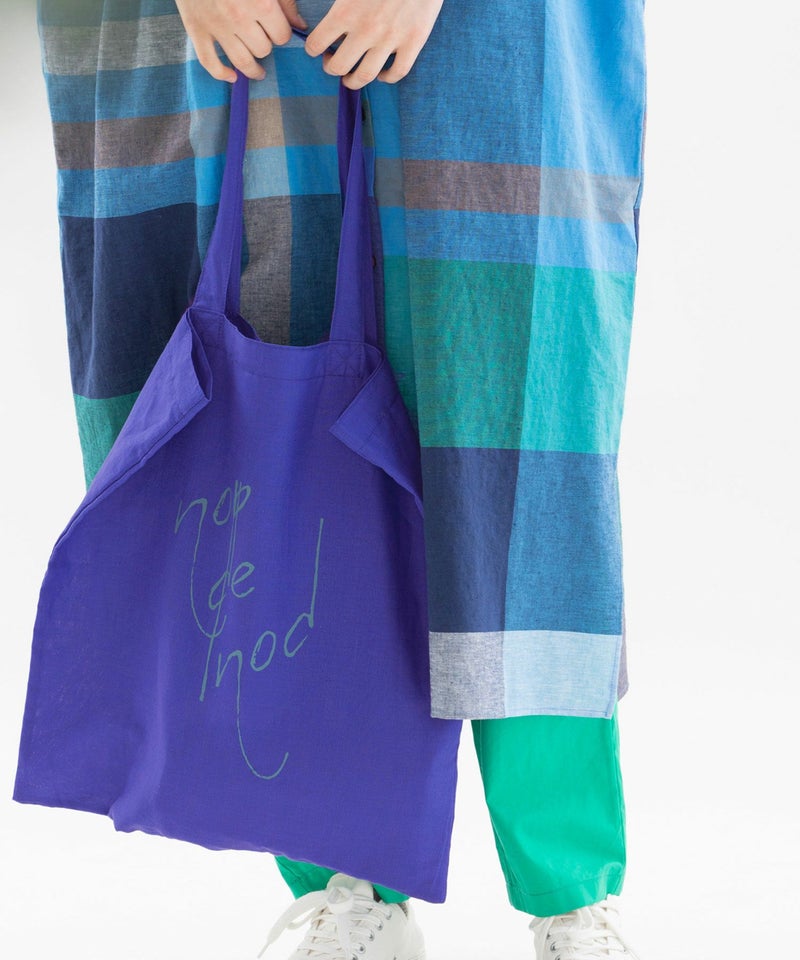 ラミー麻混の発色が良い軽い生地を使った、5色のカラフルなカラー展開です。Tシャツとお揃いの書き文字ロゴプリント入り。