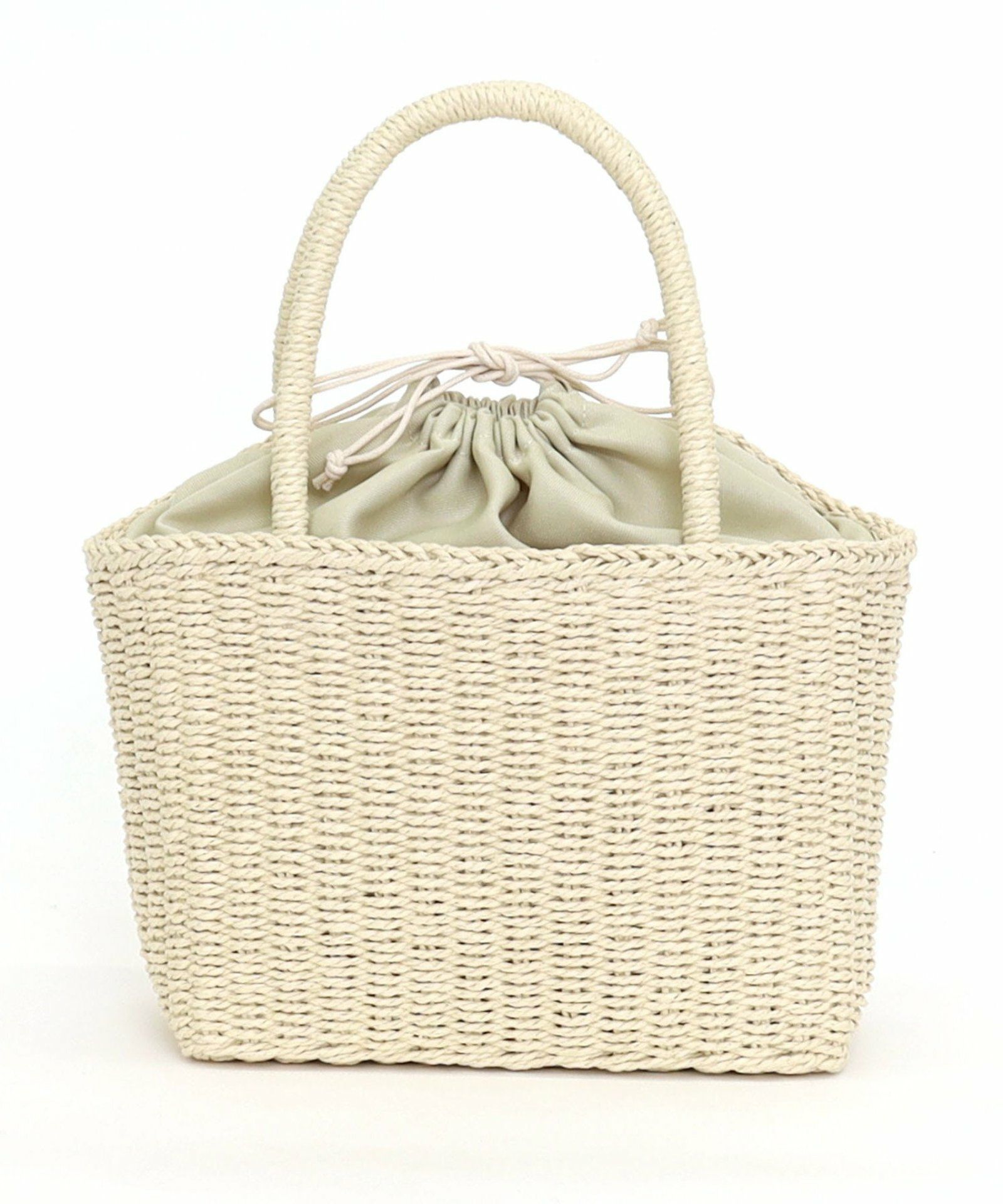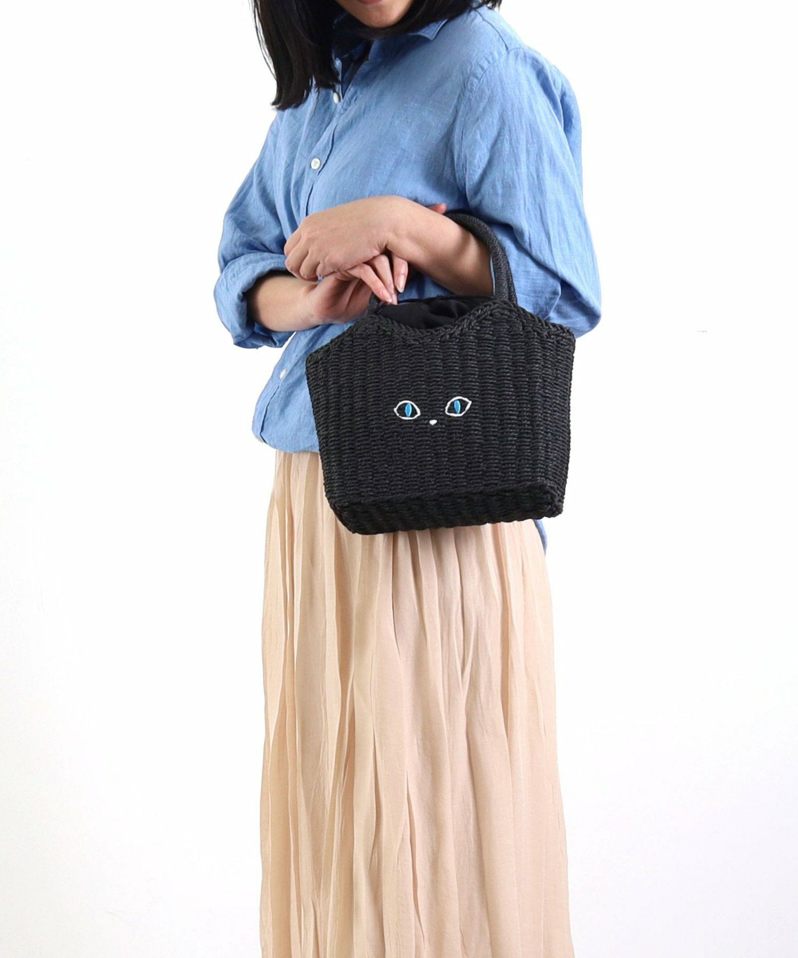 ペーパーのカゴバッグに猫の目を刺繍したバッグ