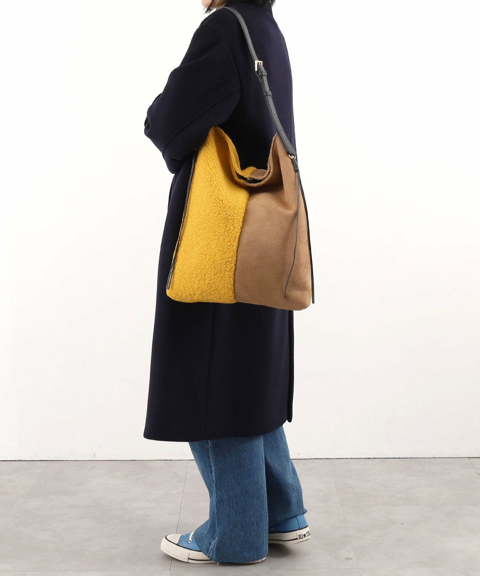 シンプルながらもバイカラーデザインが特徴のムートン風ショルダーバッグです。