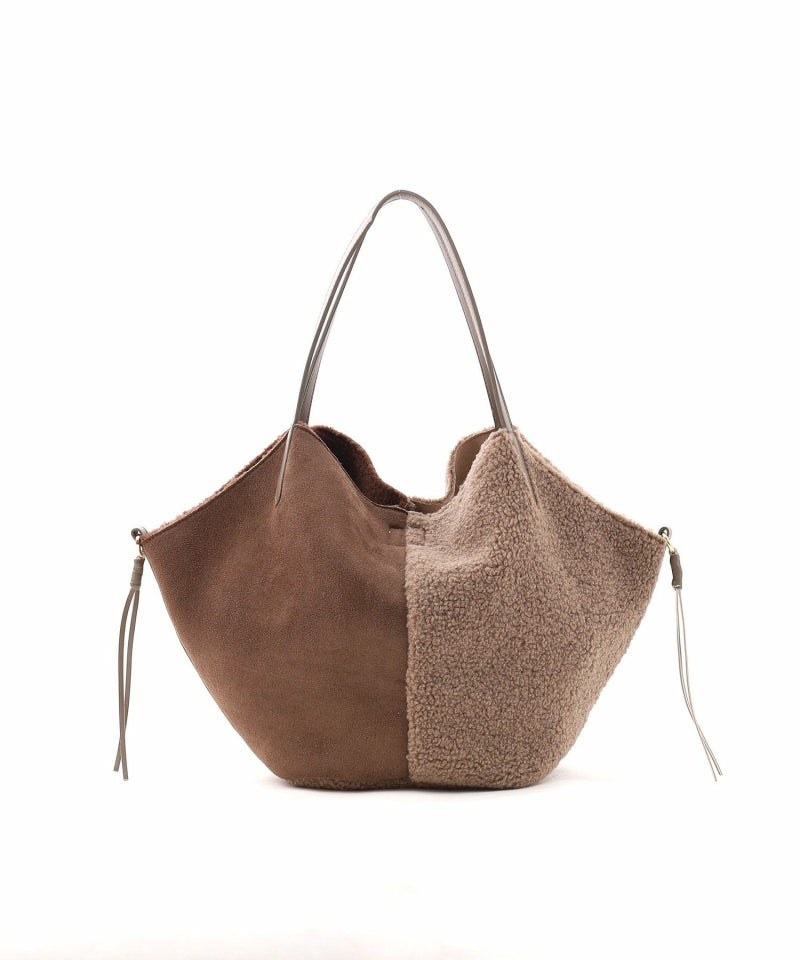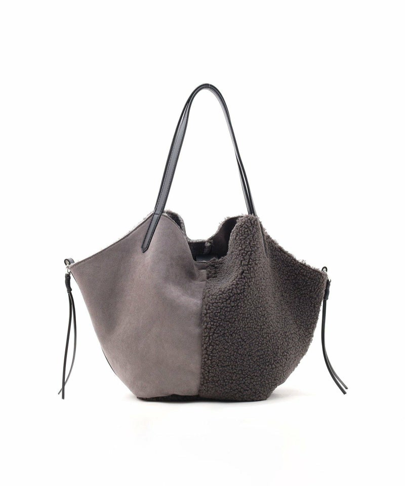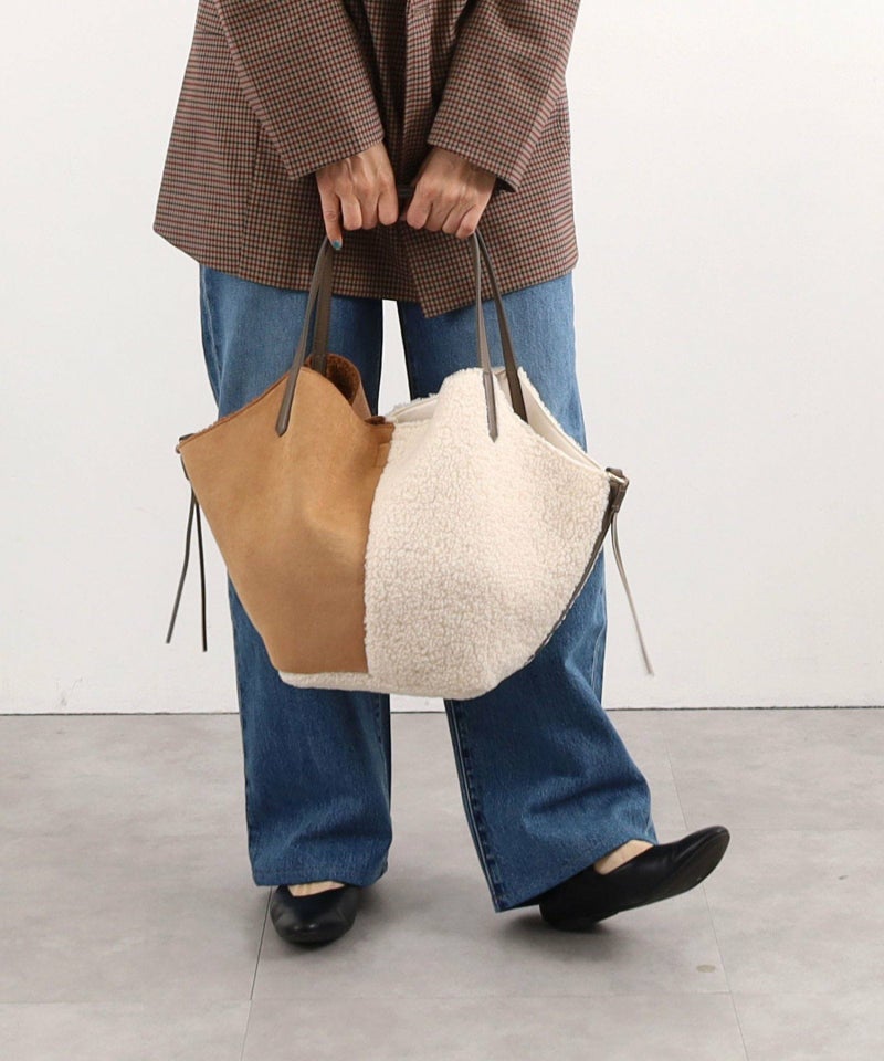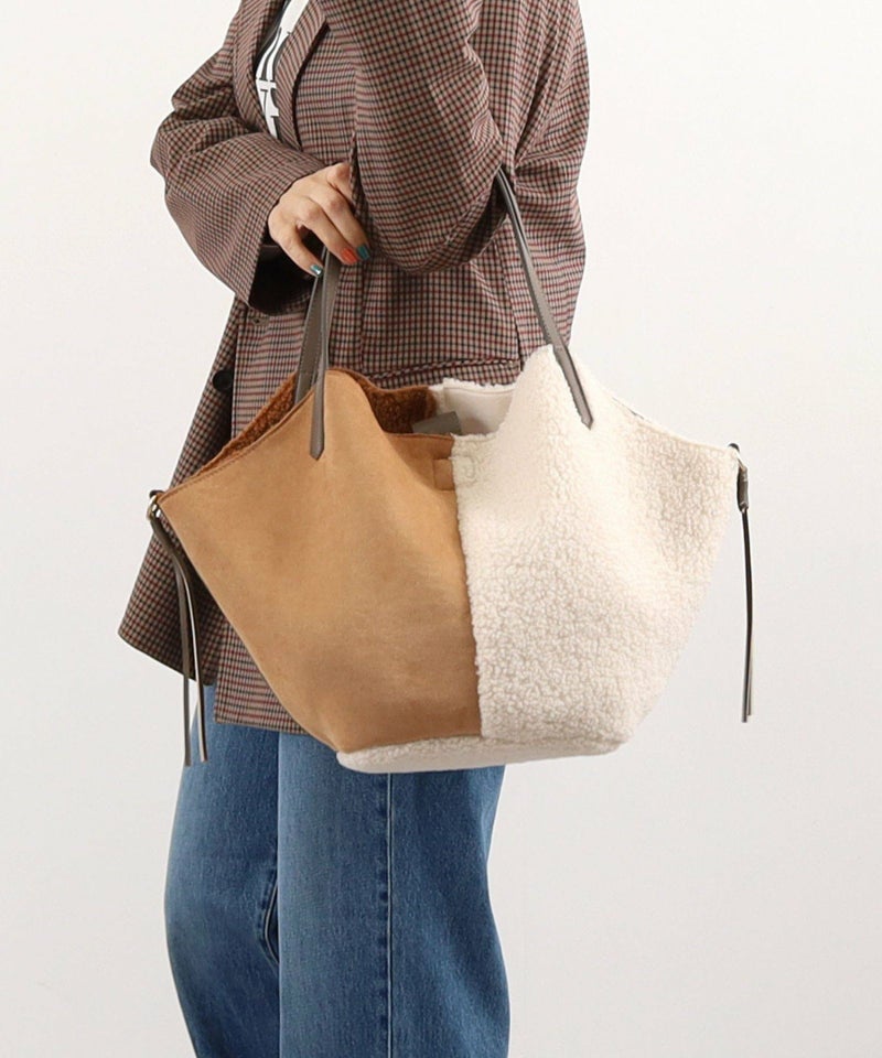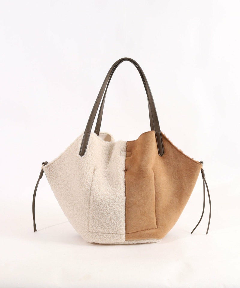 シンプルながらもバイカラーデザインが特徴のムートン風トートバッグです。
