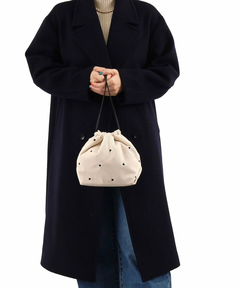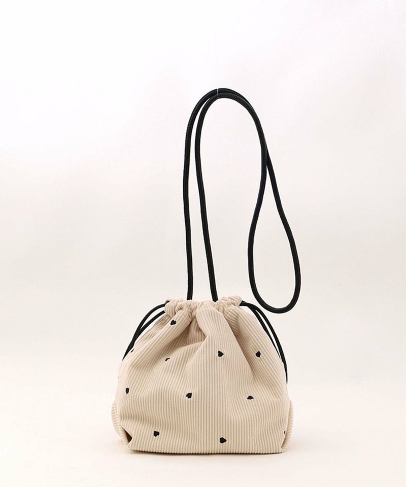 ハート刺繍が可愛いコーデュロイ巾着バッグ。