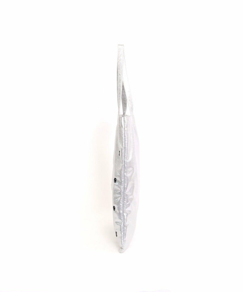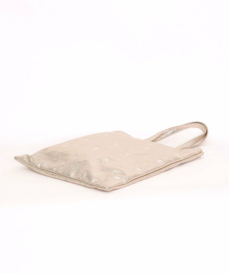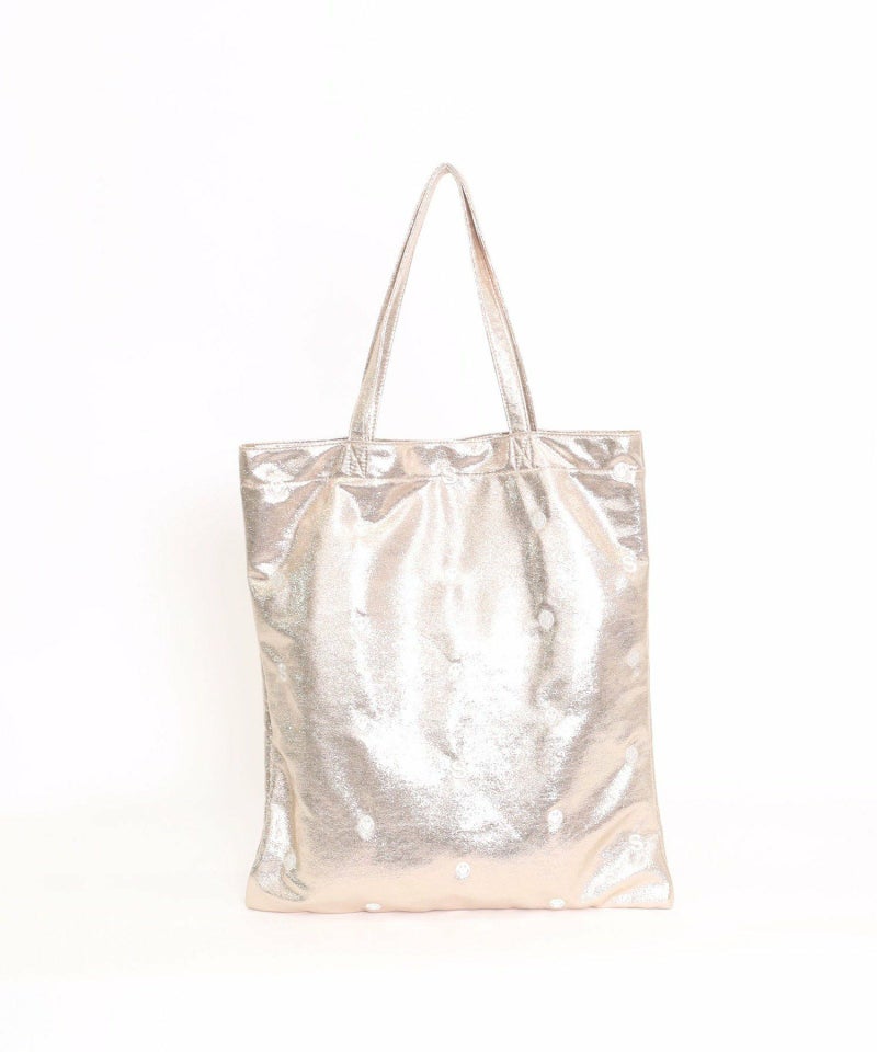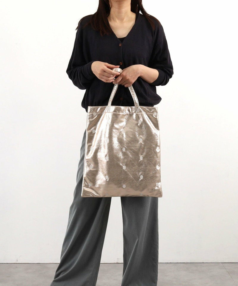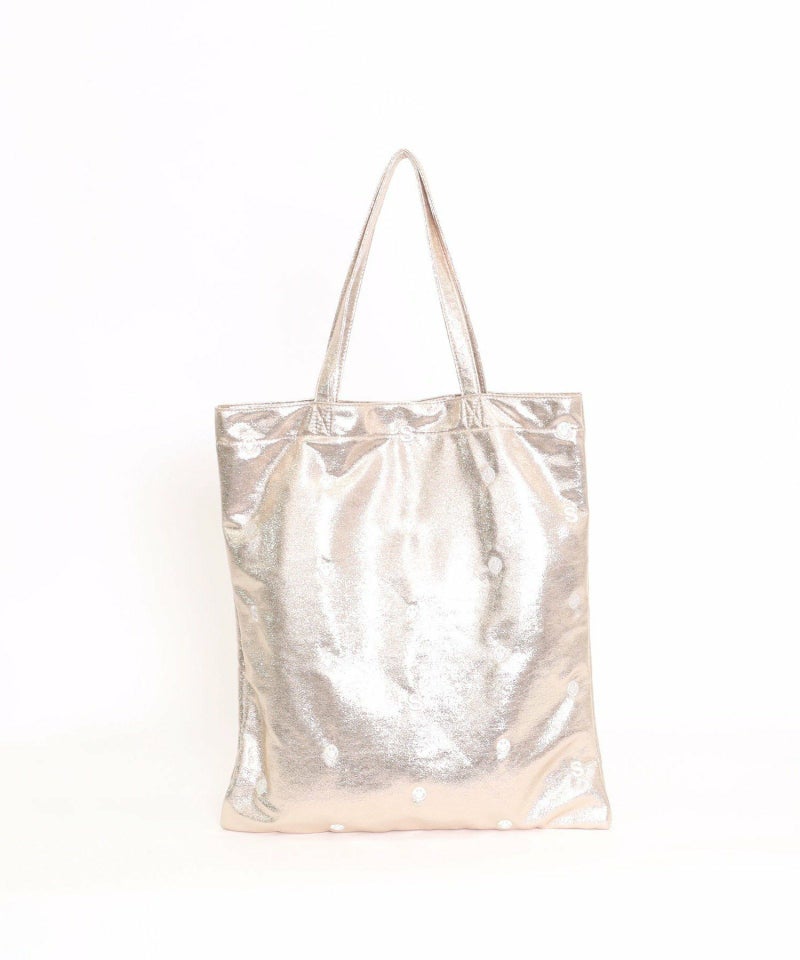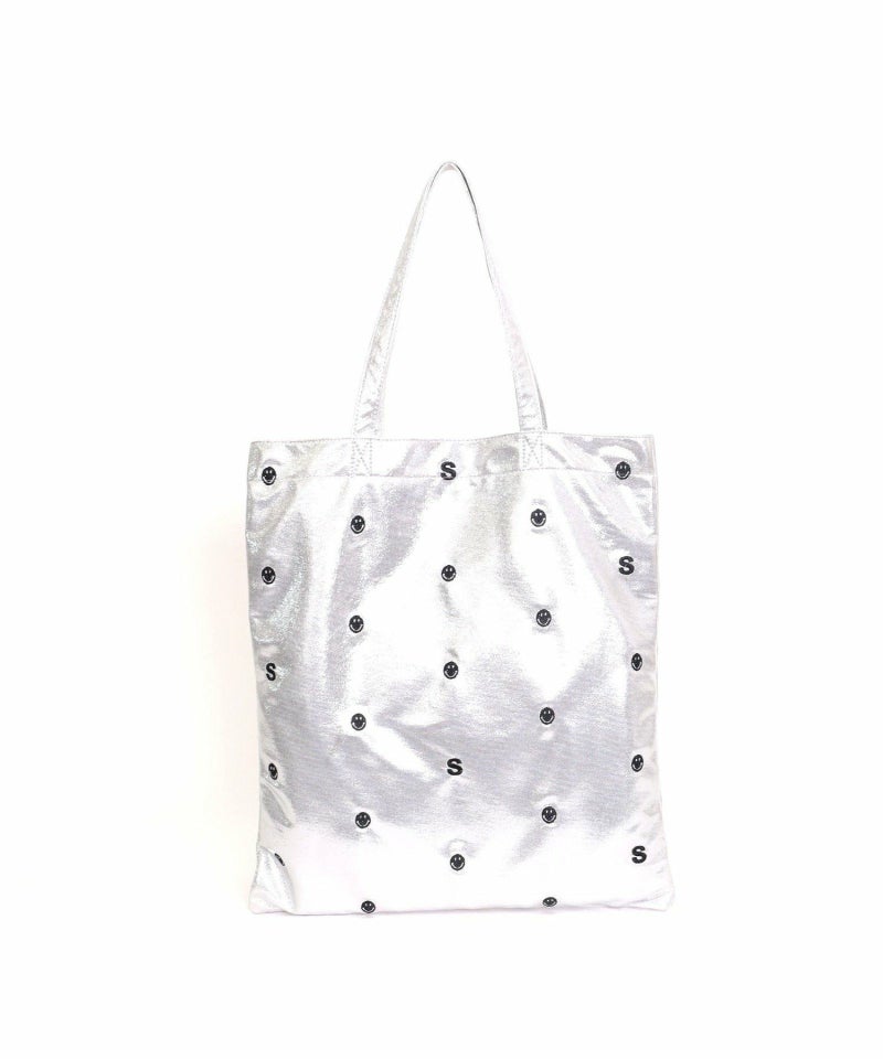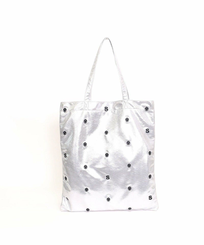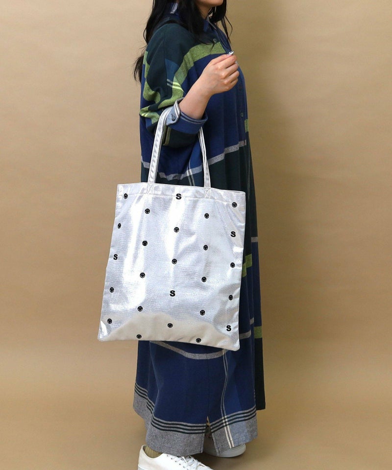 メタリック生地にドット柄のようにちりばめられたSMILEYフェイスと頭文字の「S」の刺繍が最高にかわいい万能バッグ。