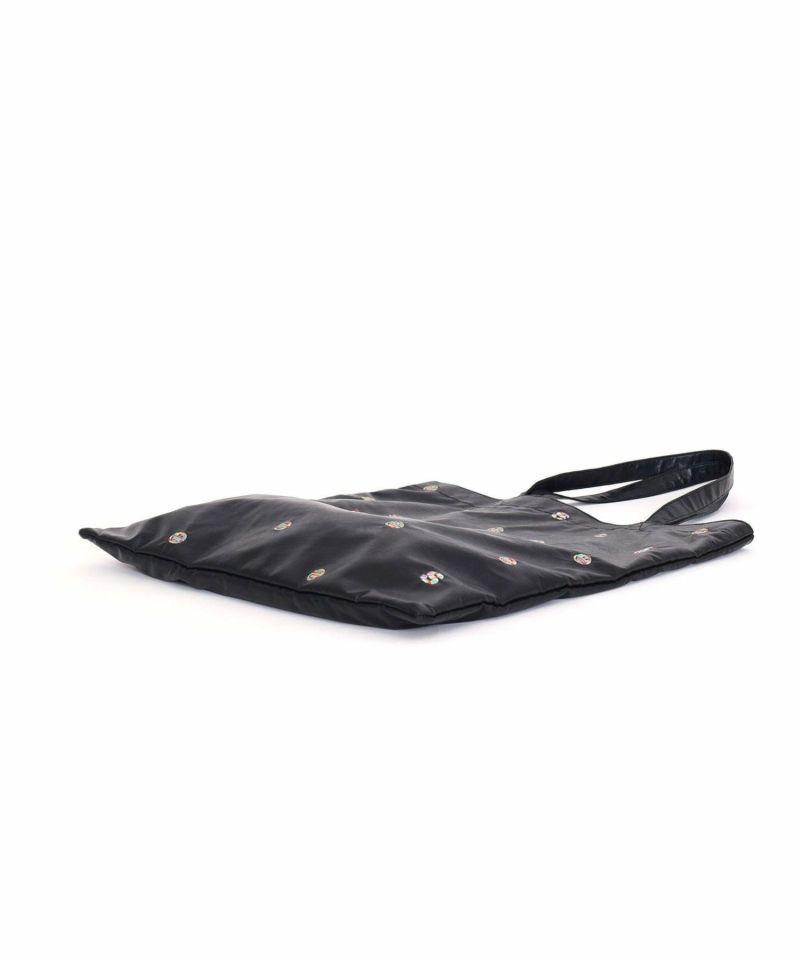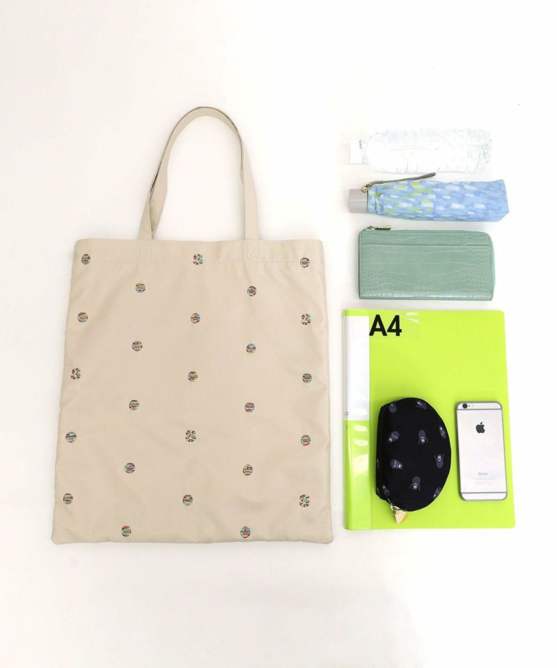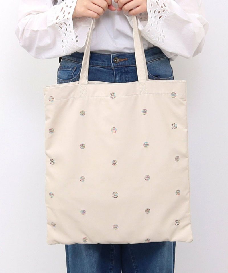 シンプルなモノトーン色のフェイクレザーにドット柄のようにちりばめられたPOPなSMILEYフェイスと頭文字の「S」の刺繍が最高にかわいい万能バッグ。