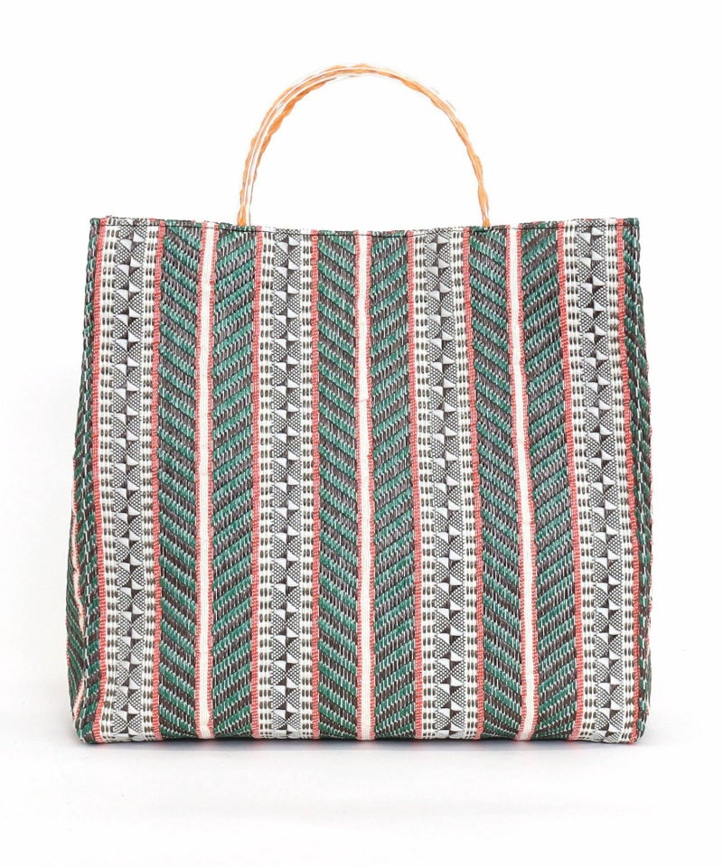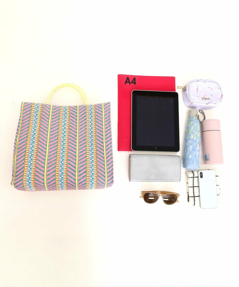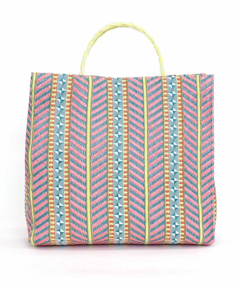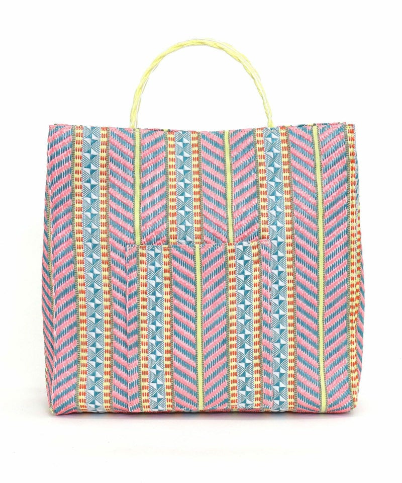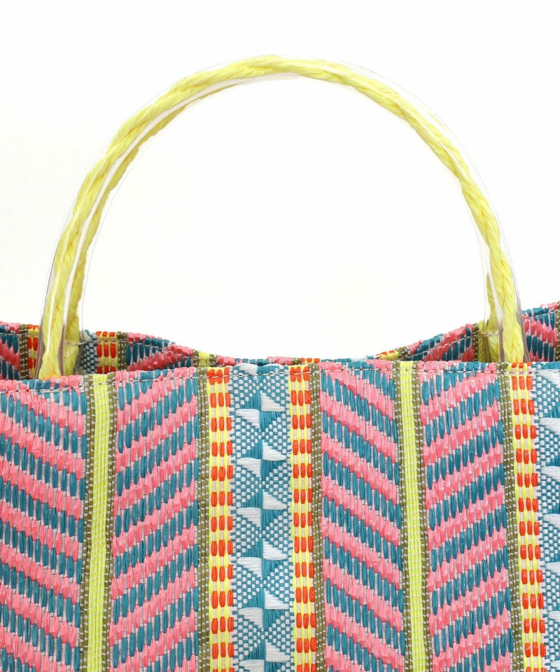 発色がいいポリプロピレン素材でカラフルな柄に編み上げたシート素材を、シンプルなスクエア型のバッグに落とし込みました。