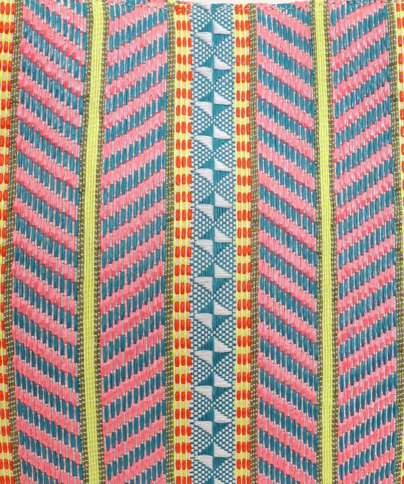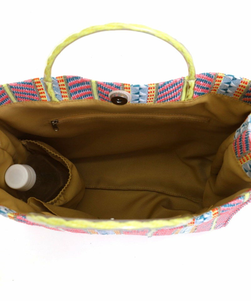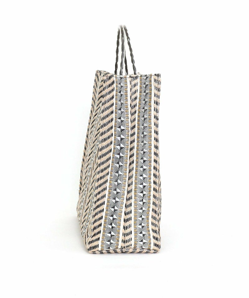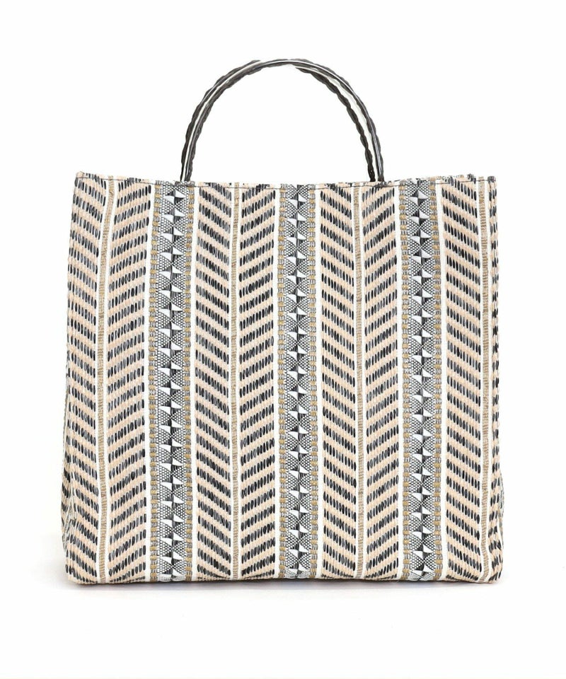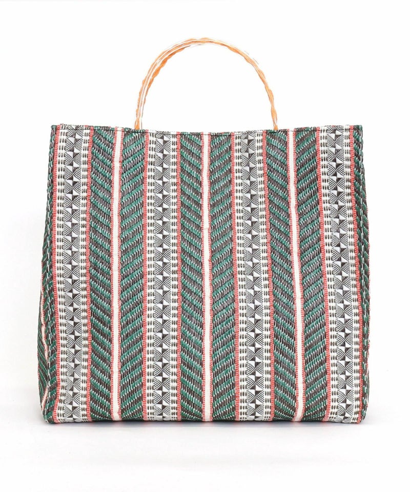 発色がいいポリプロピレン素材でカラフルな柄に編み上げたシート素材を、シンプルなスクエア型のバッグに落とし込みました。