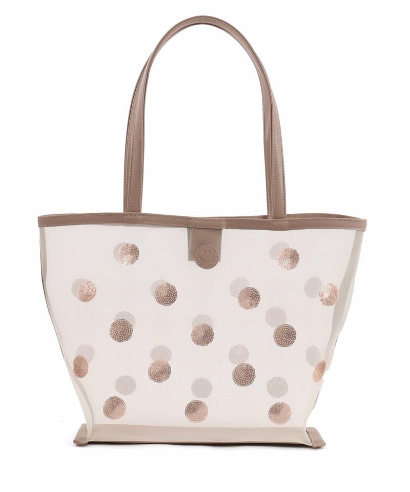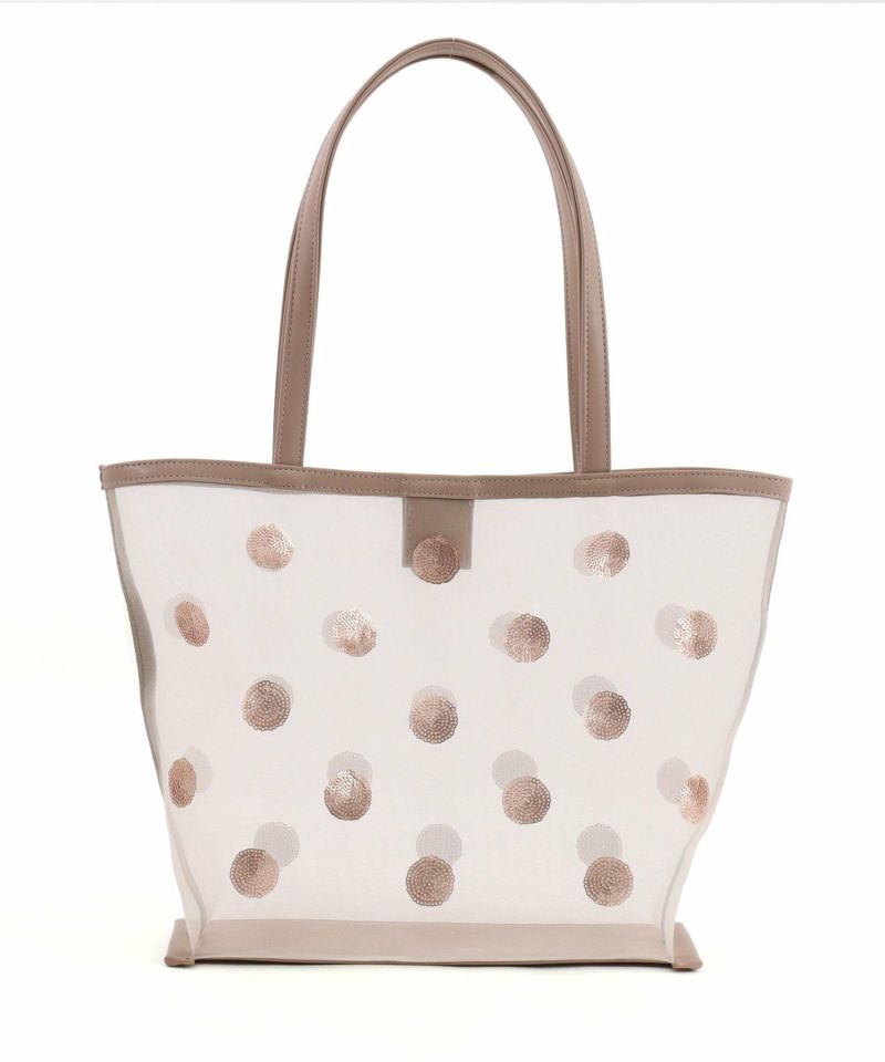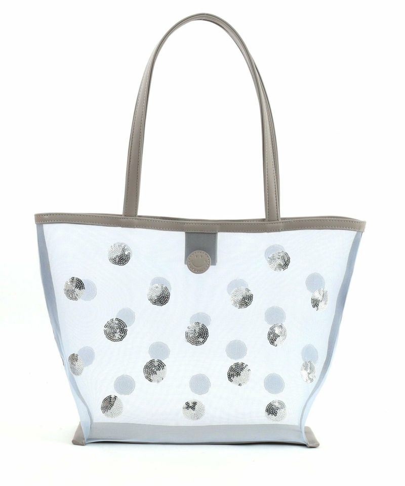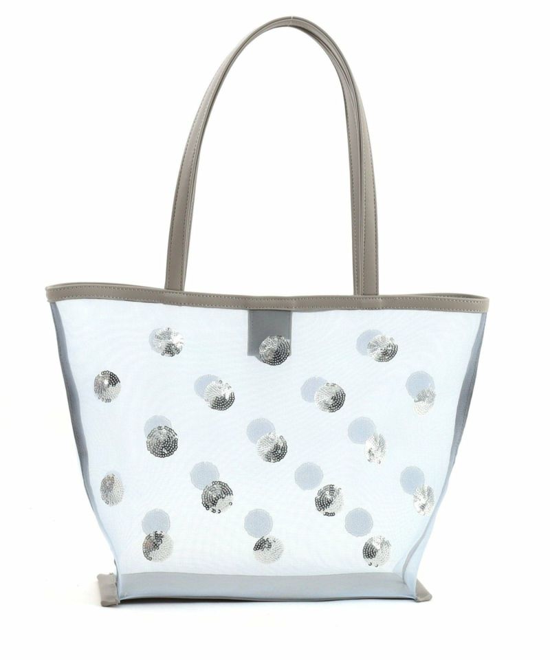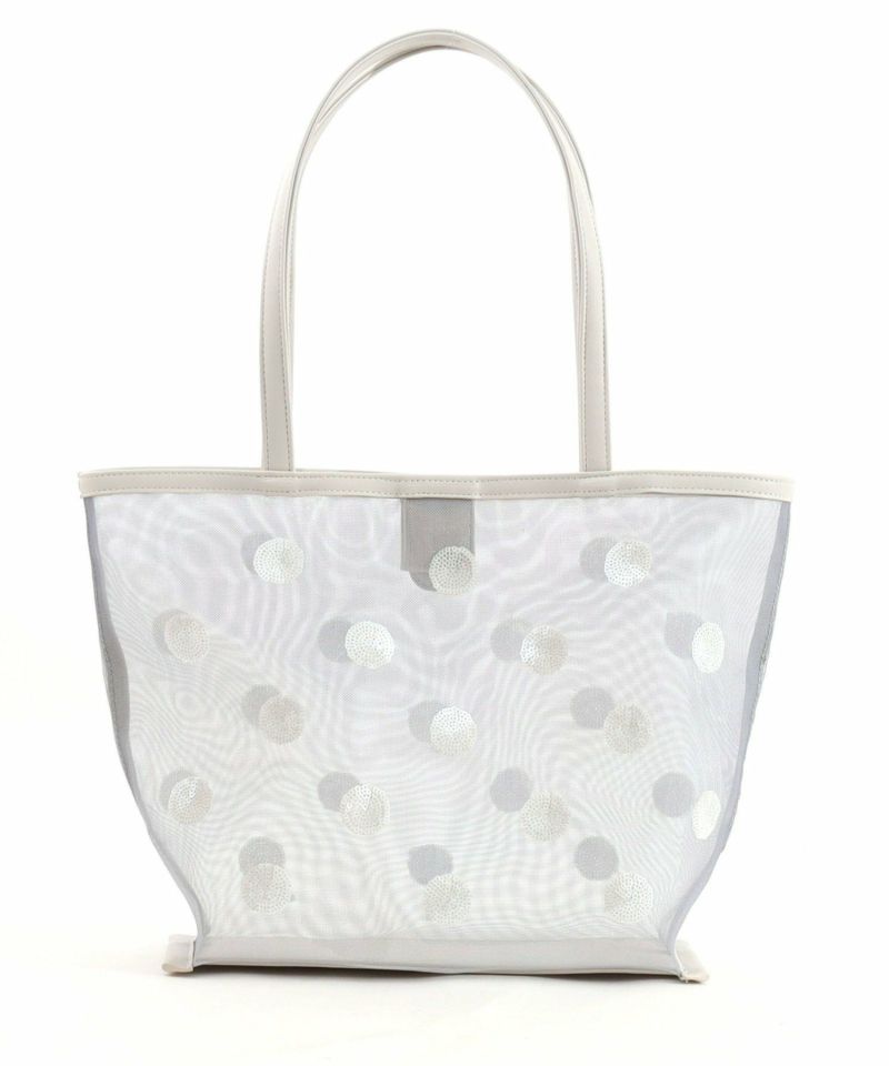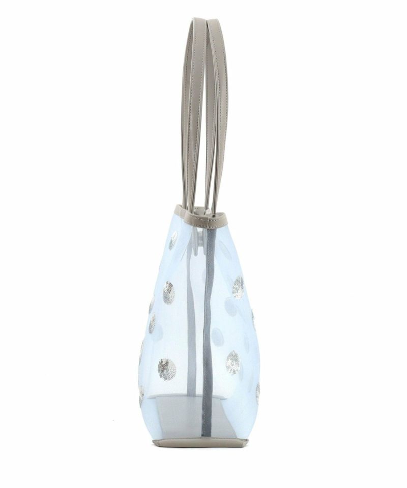 春夏らしい涼しげなメッシュ素材の1枚仕立ての本体に、キラキラ輝くスパンコールを刺繍。