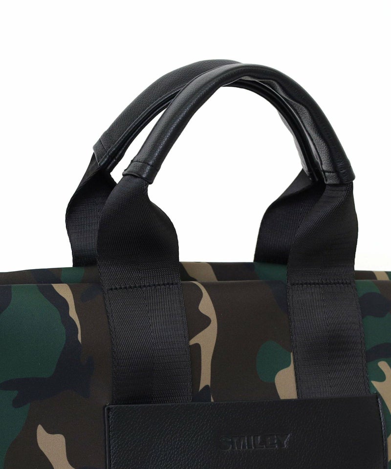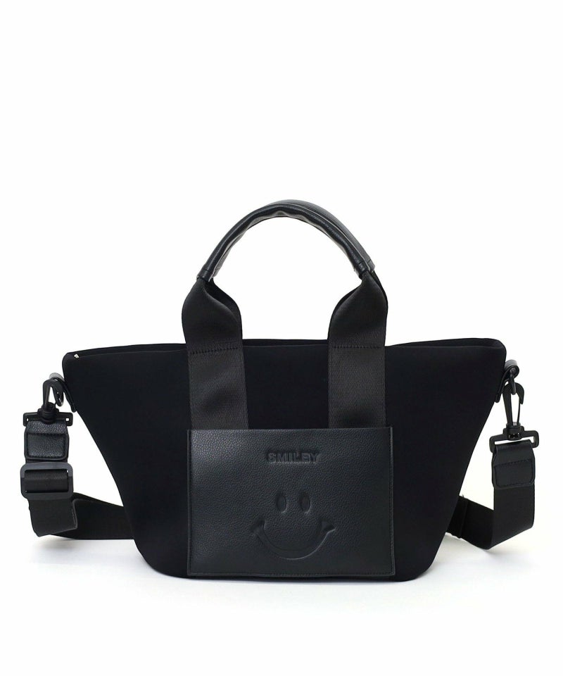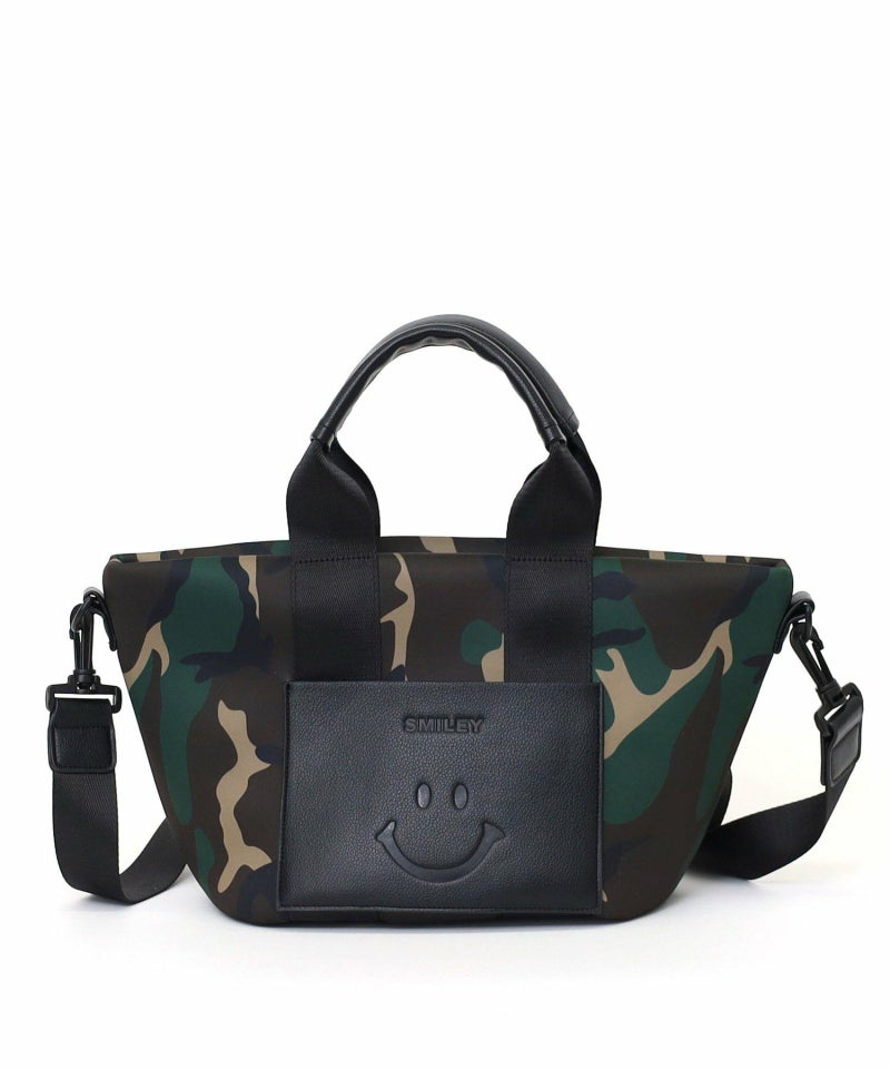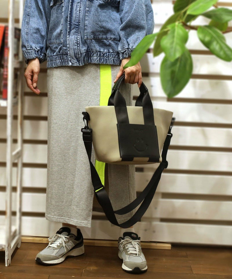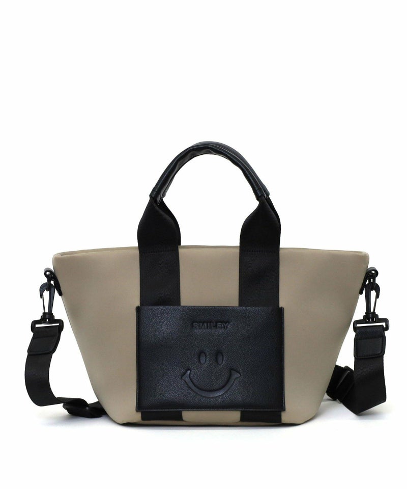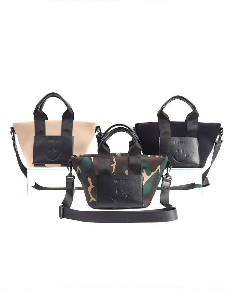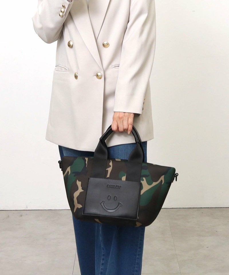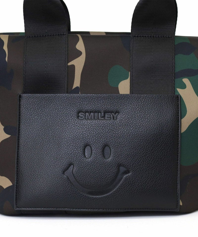 表面に大きなSMILEYフェイスが刻印されたフェイクレザーのオープンポケット付き。