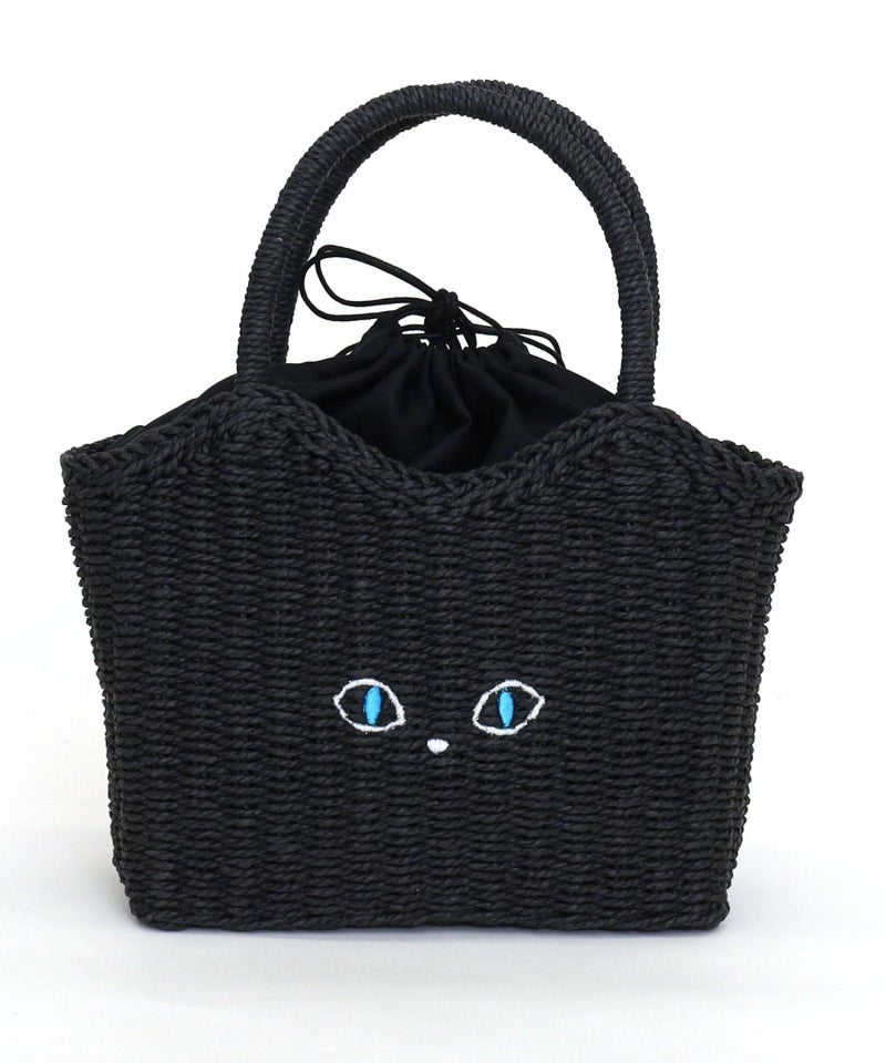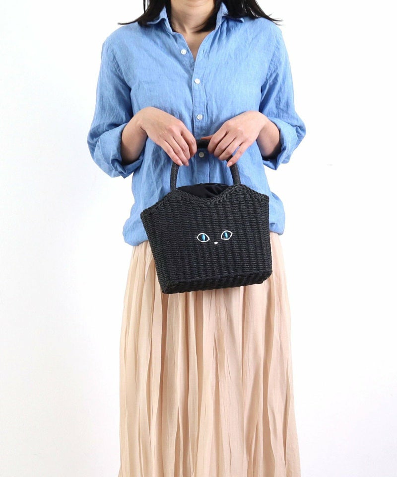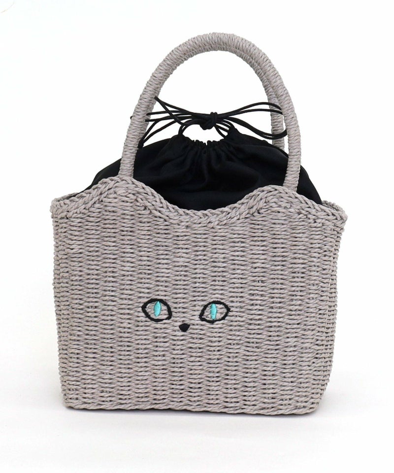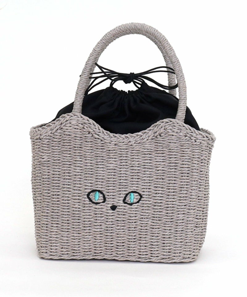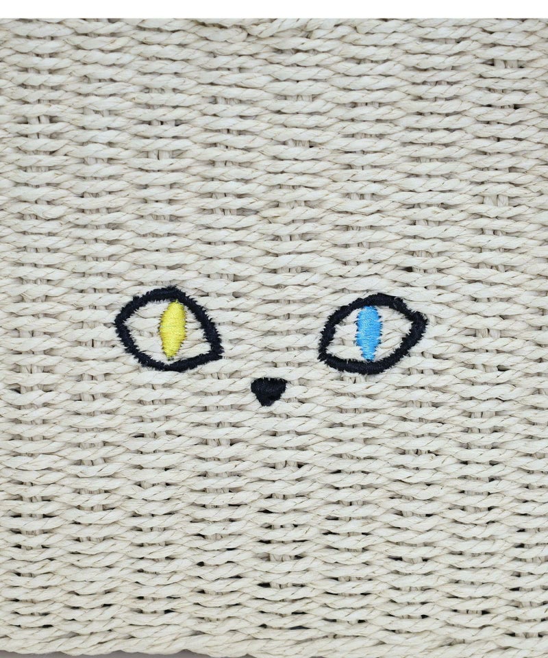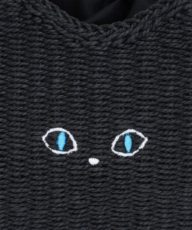 ペーパーのカゴバッグに猫の目を刺繍したバッグ