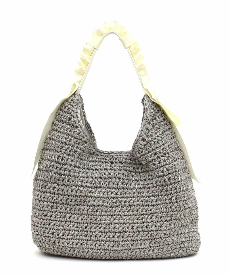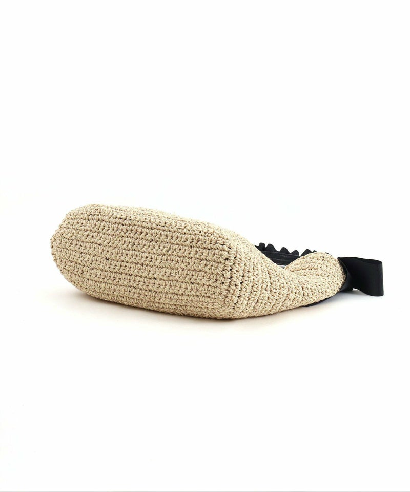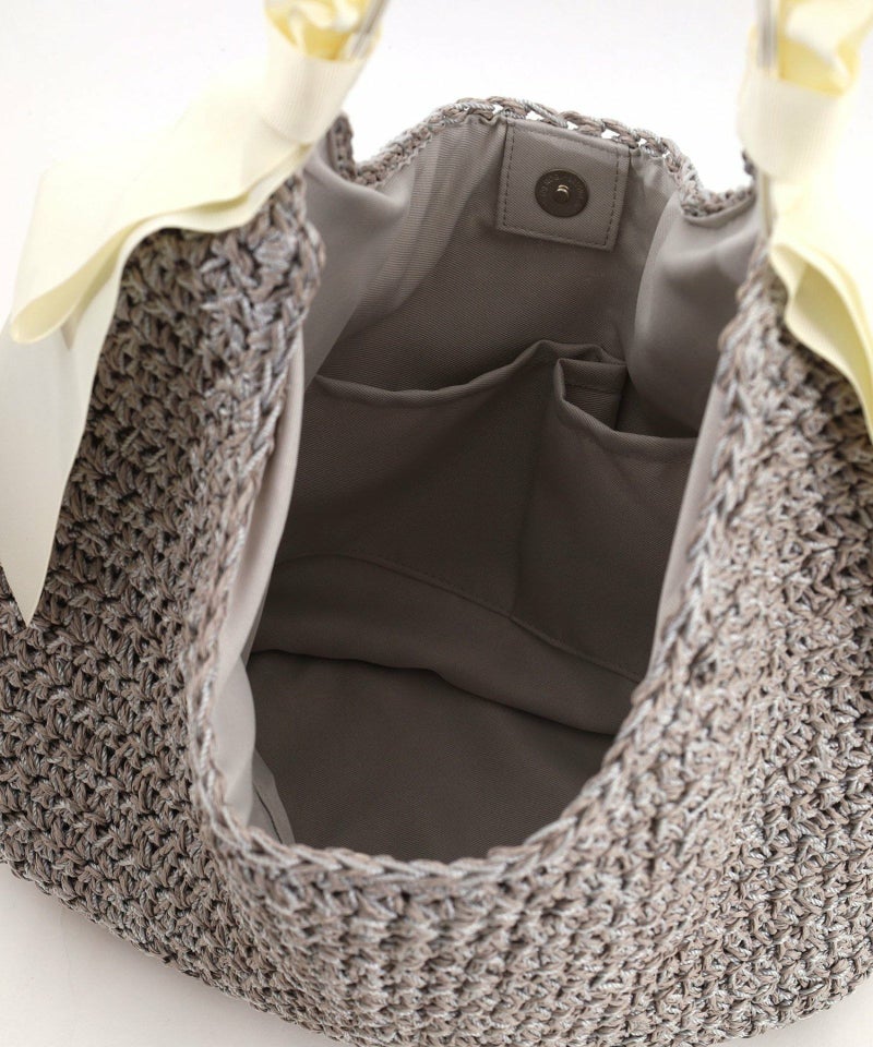 柔らかな本体には、ペーパーと光沢のあるポリエステルのカラー紐をミックスして編みこんでいます。