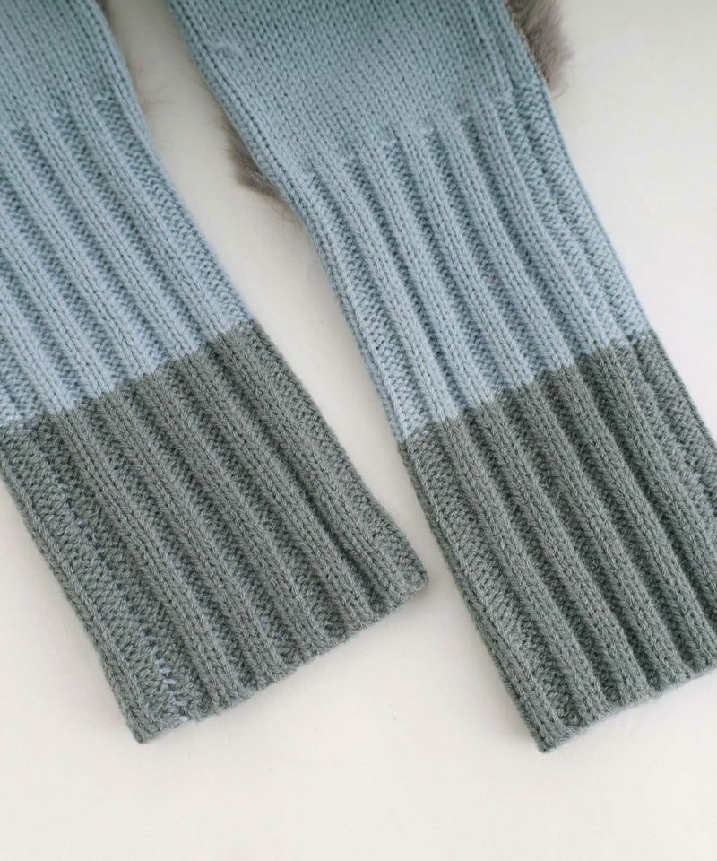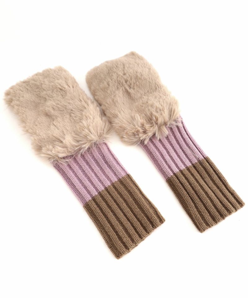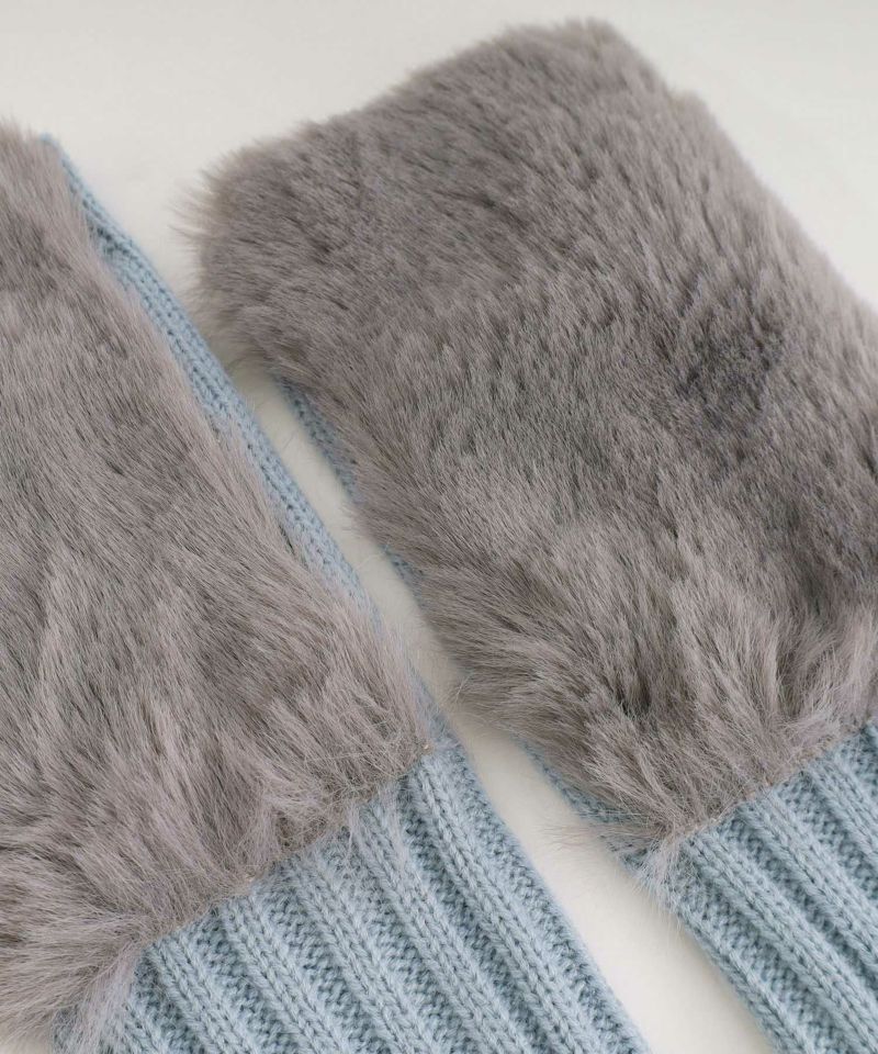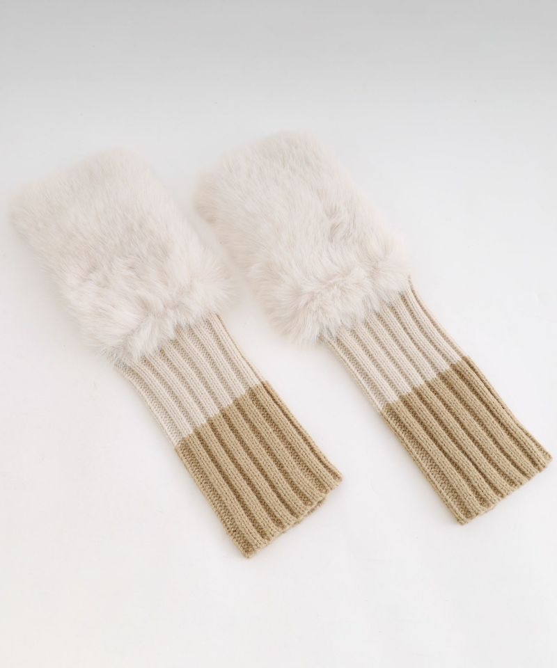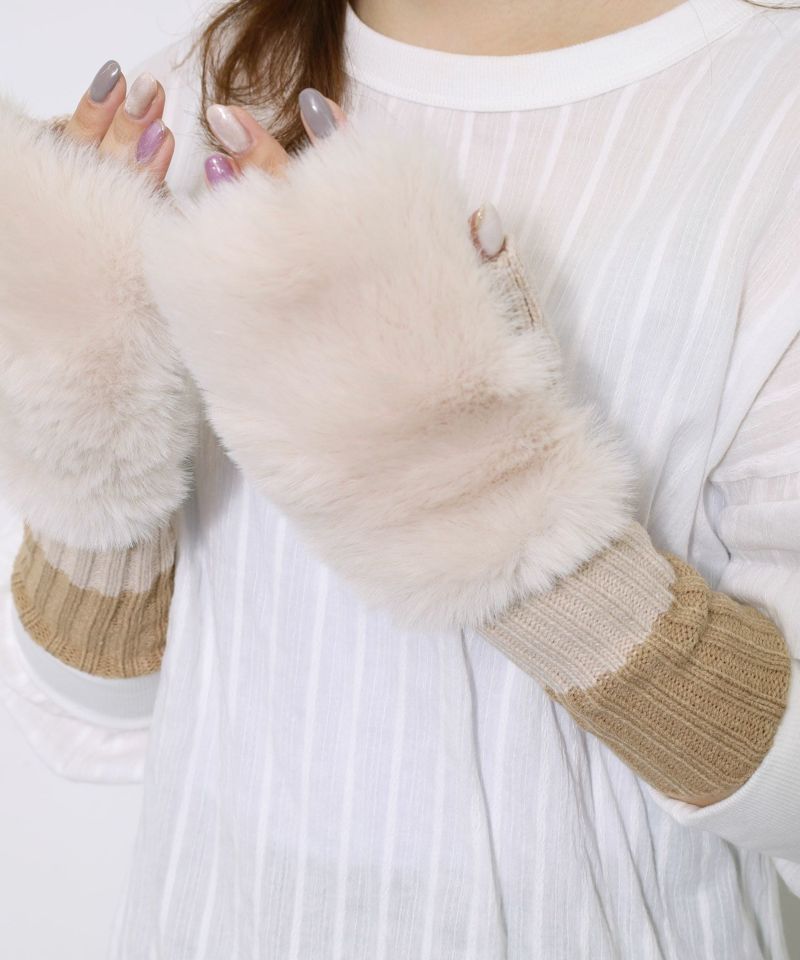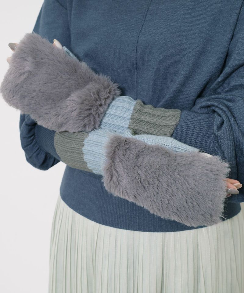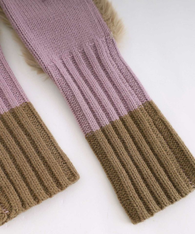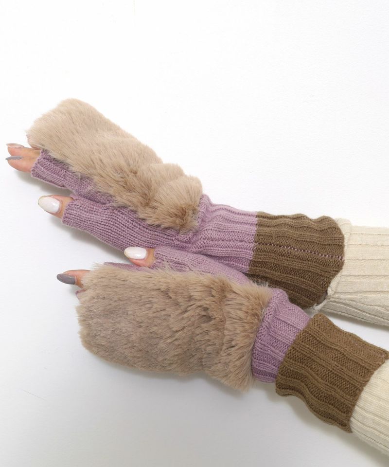 手を動かしやすい伸縮性のあるニットがベースの手袋。柔らかなフェイクファーを付けてアクセントにしました。フィンガーレス仕様なのでスマホの操作もラクチンです。