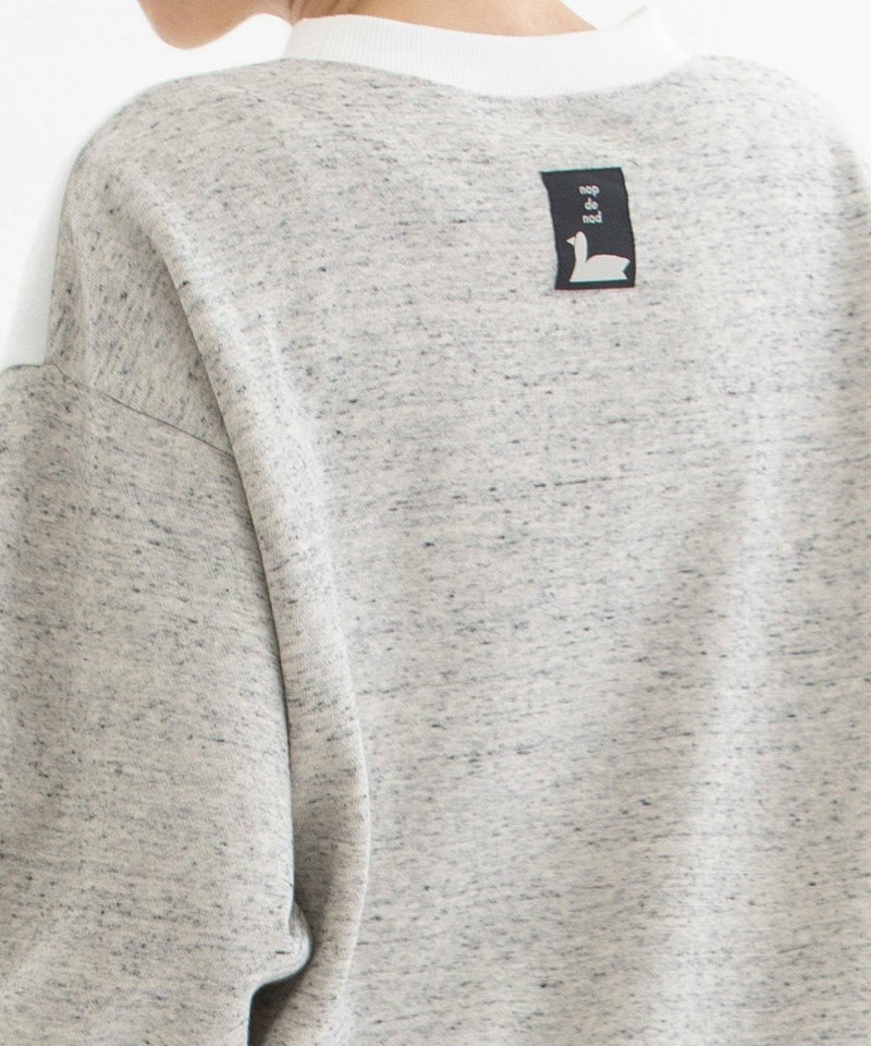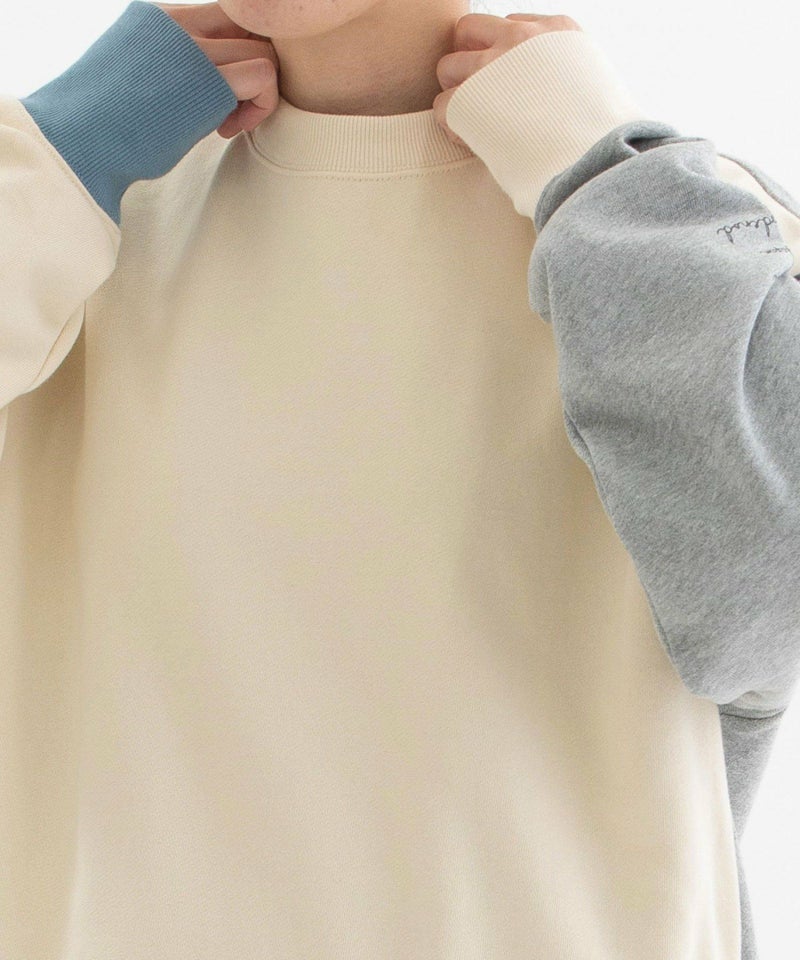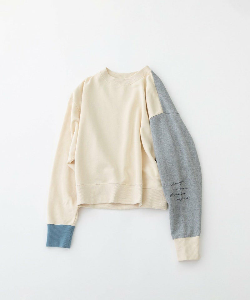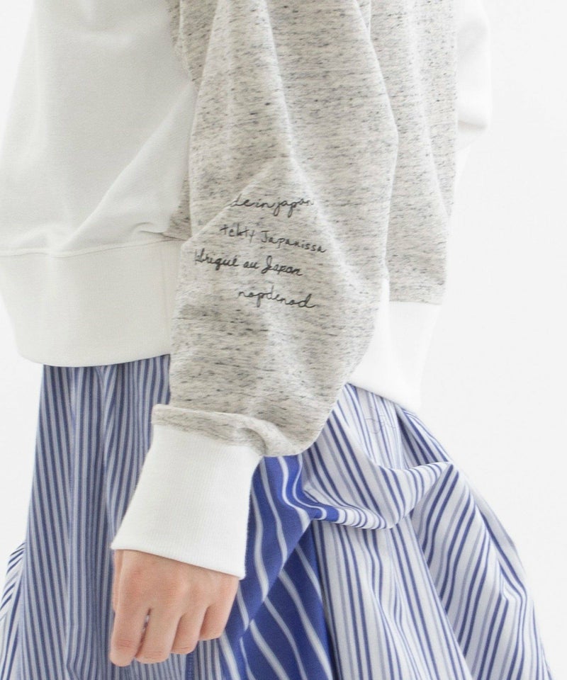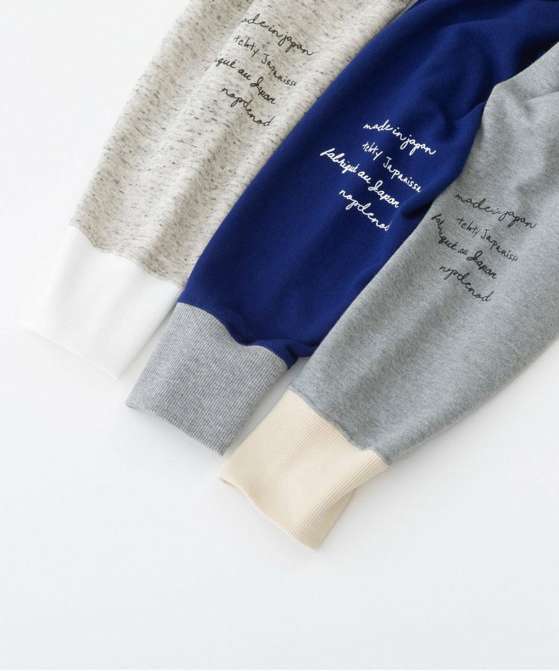 3色を組み合わせた、ゆったり身巾と長すぎない丈のトップス。今らしい長めの袖にはロゴプリントが入ってポイントになっています。ロゴプリント=made in japanを英語フィンランド語仏語で入れています。