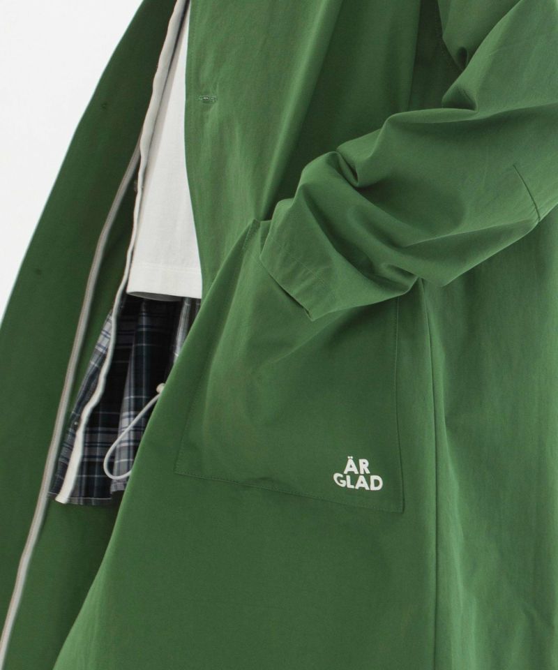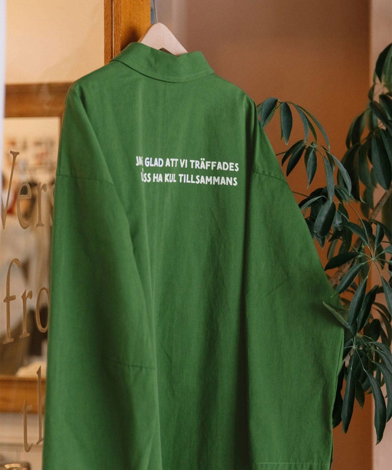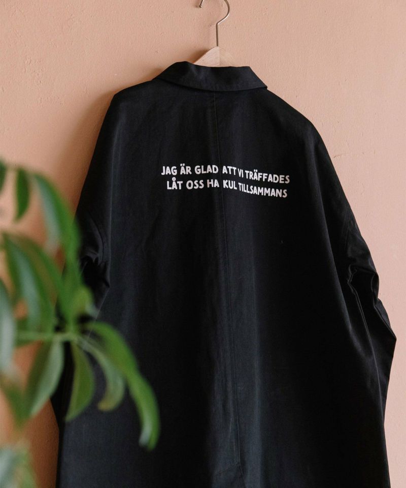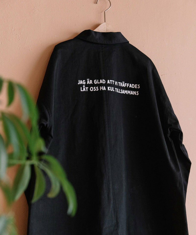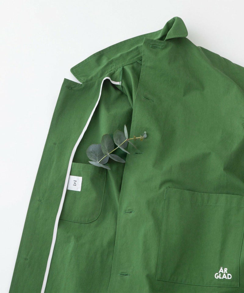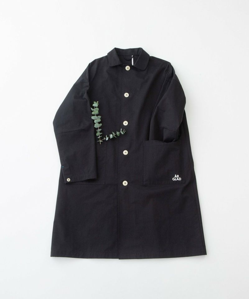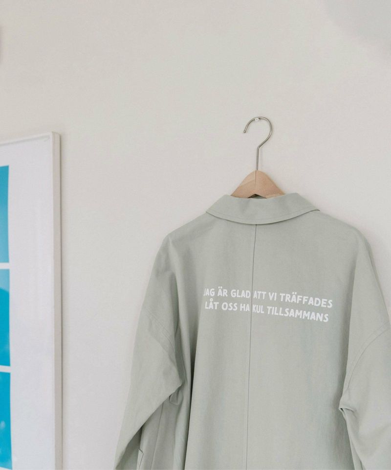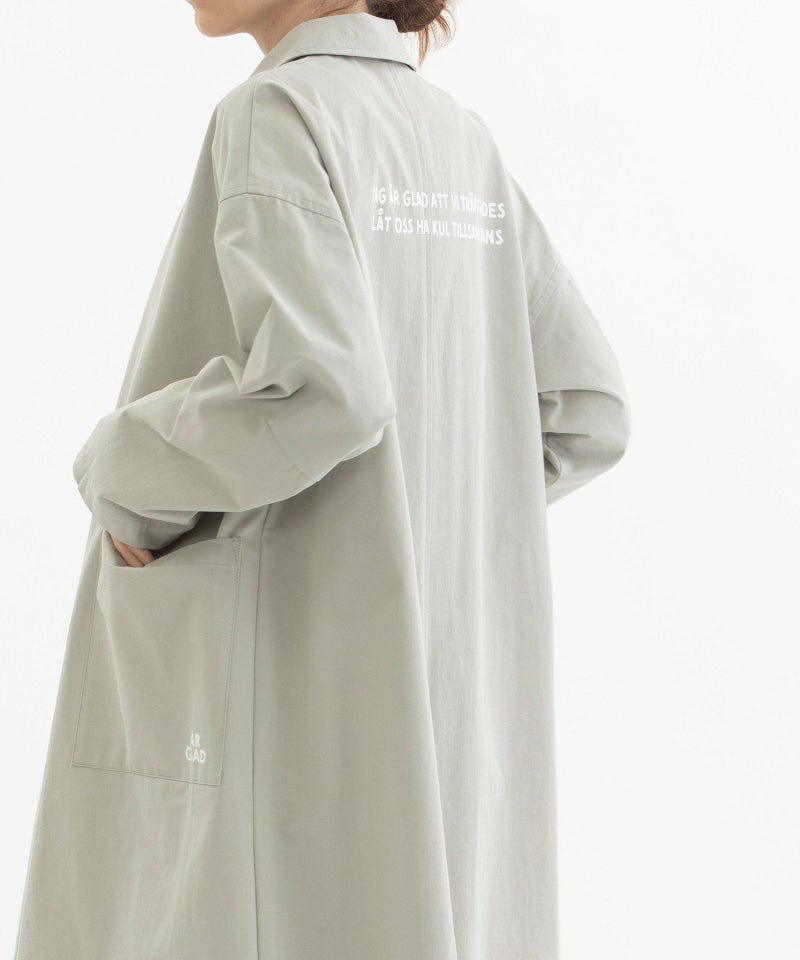 バックロゴプリント入りのさらりと羽織れるワークコート。春秋着られる厚すぎない軽めのコットンツイルを使用しています。前左ポケットにもプリントを入れてさりげないポイントに。ユニセックス対応で袖丈は長めです。内ポケットつき。