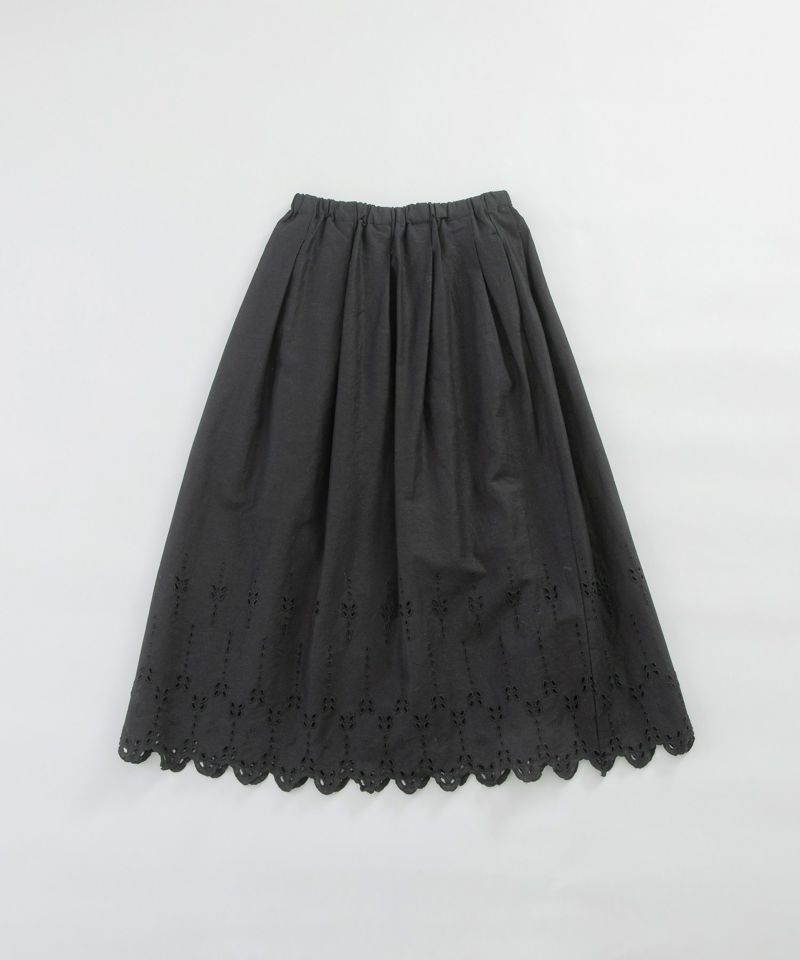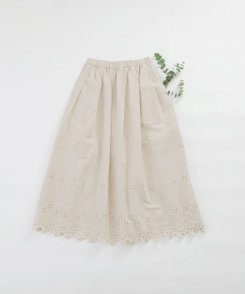 ・リネンコットンのナチュラルな生地の裾にオリジナルの刺繍を施したスカート。広がりをおさえたほどよい分量感と長すぎない丈で、ナチュラルで上品に仕立てました。