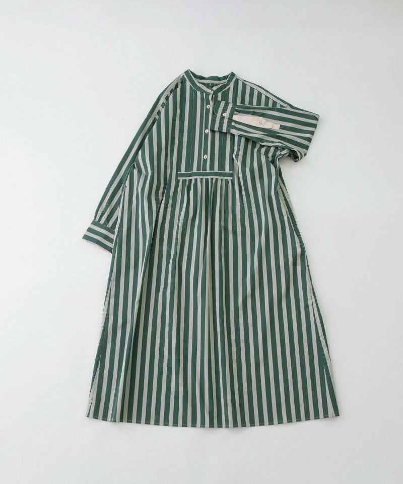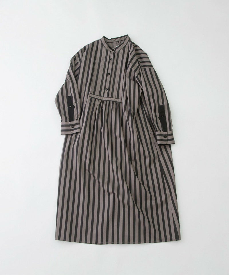 ・ビンテージメンズシャツ風のきれいな目面で、しっかり厚みのあるコットンサテンのワンピース。オリジナルのストライプ生地で、ビブヨークデザインとバンドカラーのストンとしたシルエットです。