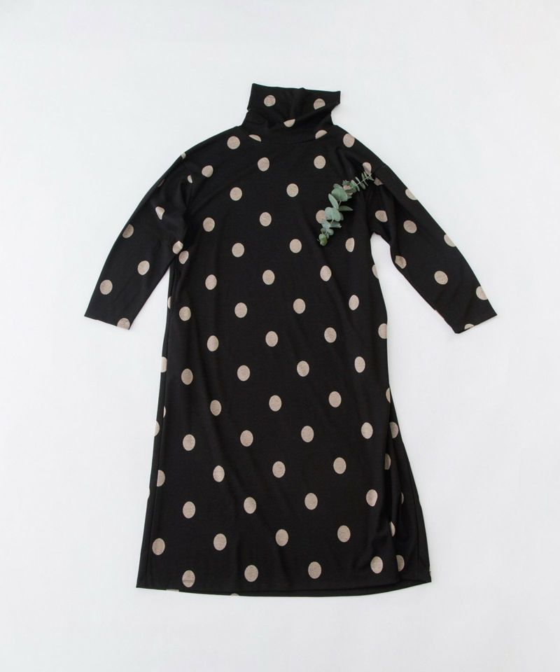 ストンと着られる暖かいワンピースを中肉のドットジャガードで仕立てました。やや裾広がりのAラインシルエットで、高めの襟と長めの袖はラフにたるませて着用頂けます。両サイドポケットつき。