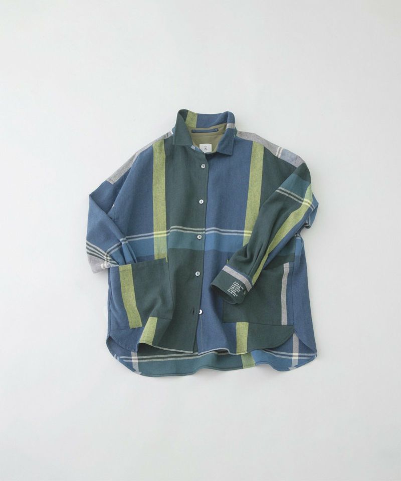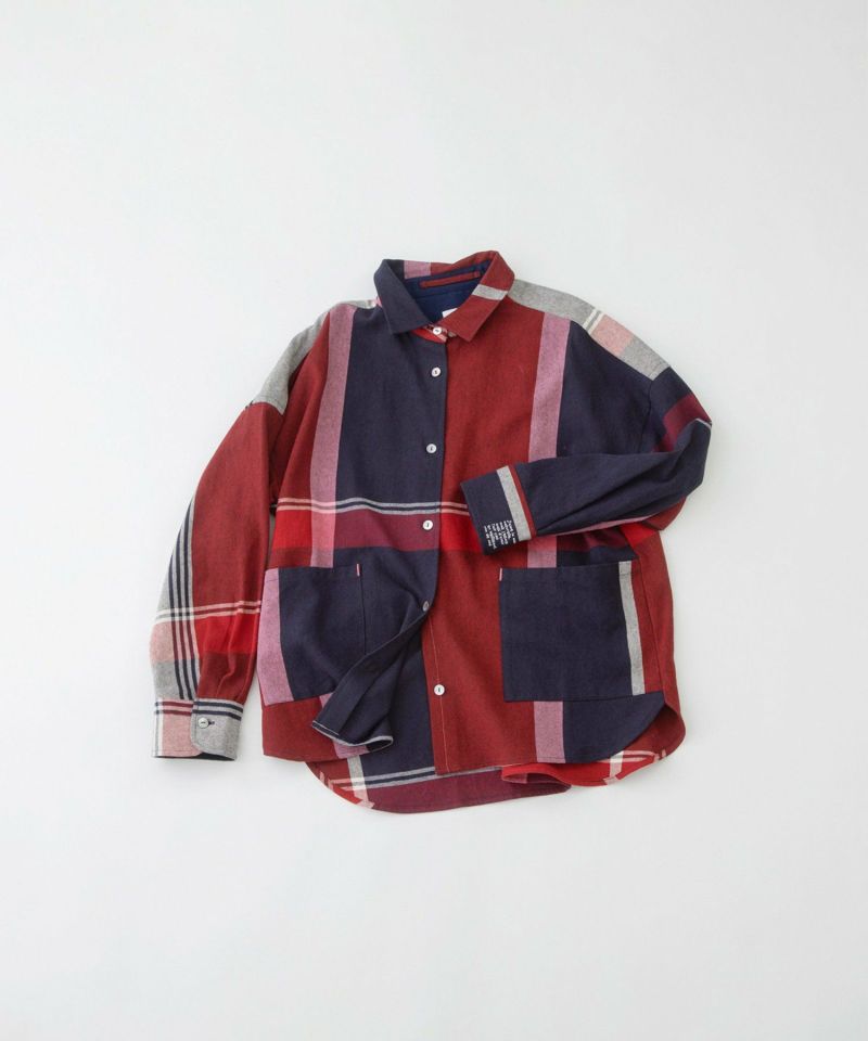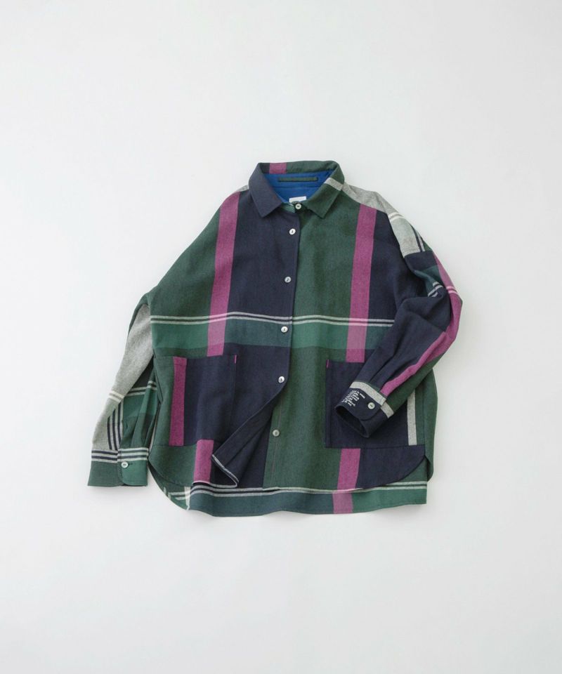 ・ゆったり身巾とドロップショルダーで、短めネルシャツ風のオーバーシャツ。羽織でも使いやすいパッチポケットがあり、後ろが長めの前後差デザインです。