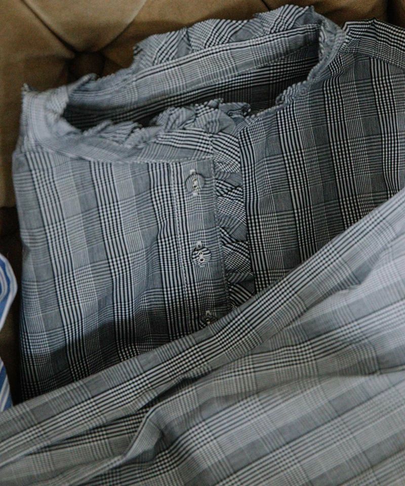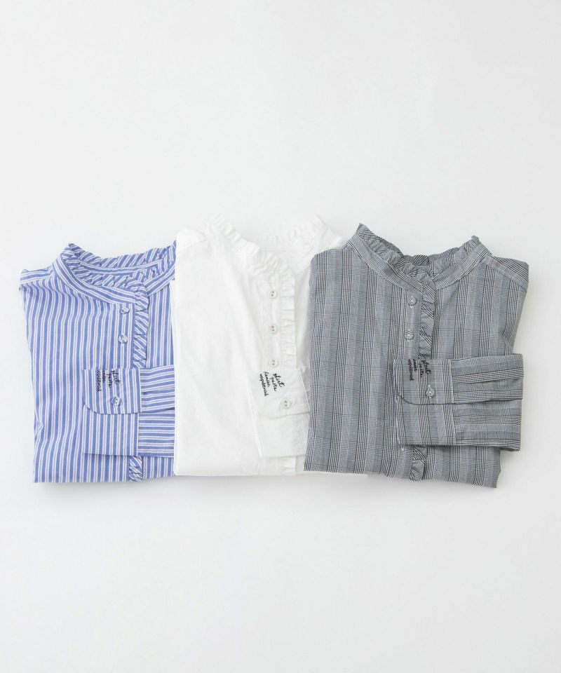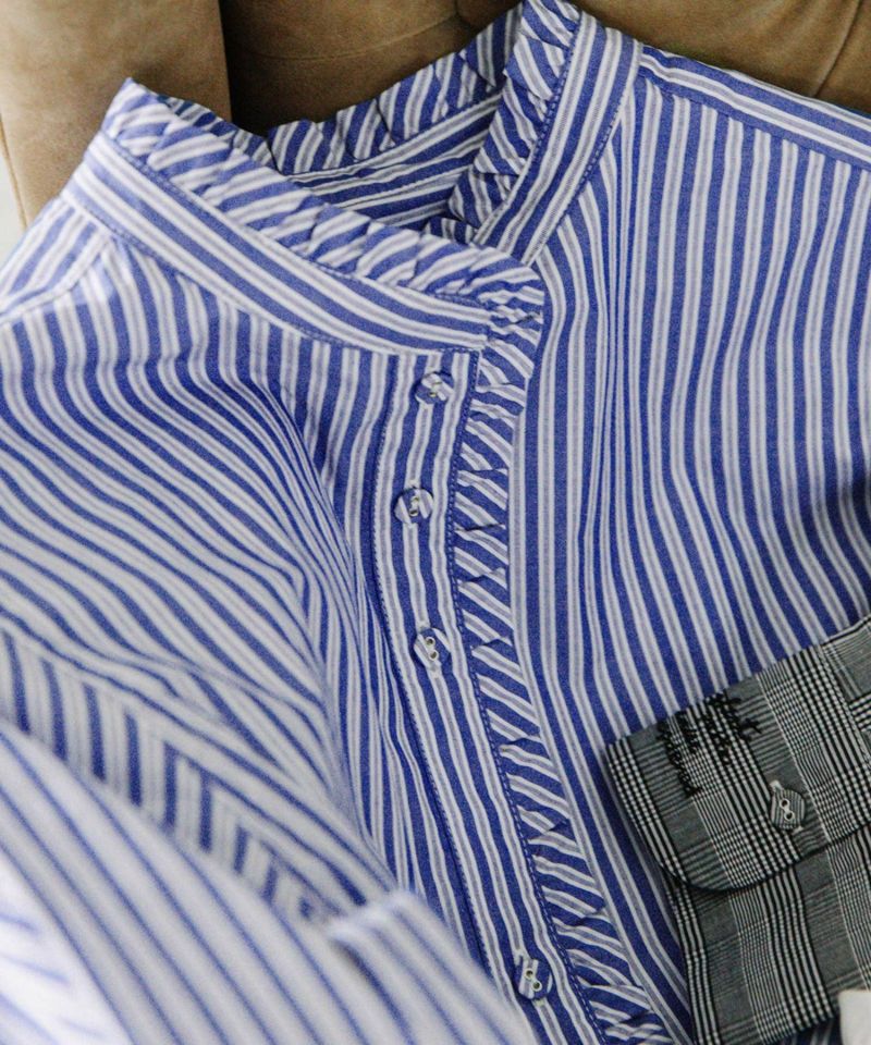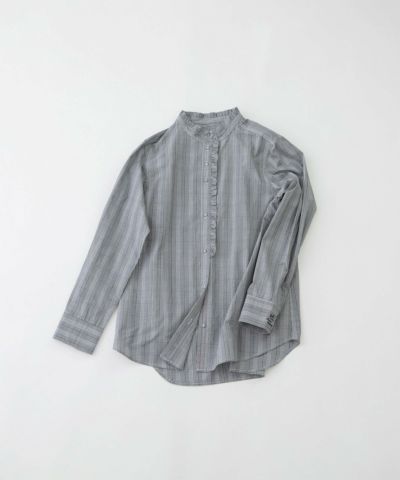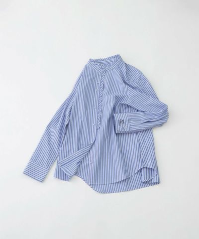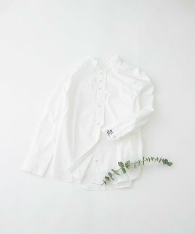 ・襟周りとフロントにフリルをあしらったシャツ。きちんとしたシルエットで甘すぎないデザインです。