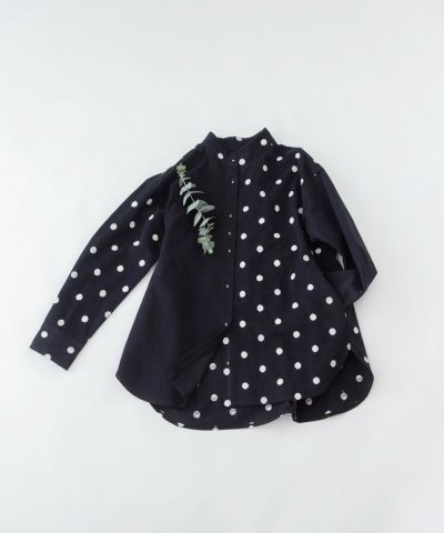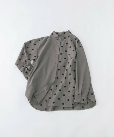 程よい厚みのあるコットンツイル起毛生地に、光沢のないざっくりとしたコットン刺繍を施したシャツ。太めのスタンドカラーで、後ろはヒップが隠れる長さの前後差デザインです。配色糸で付けたくるみボタンや、開けた時にちらりと見える配色ステッチもポイントです。