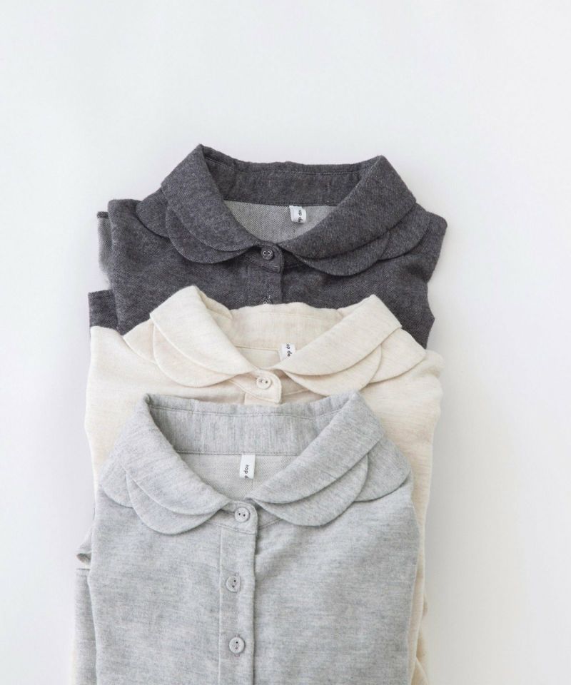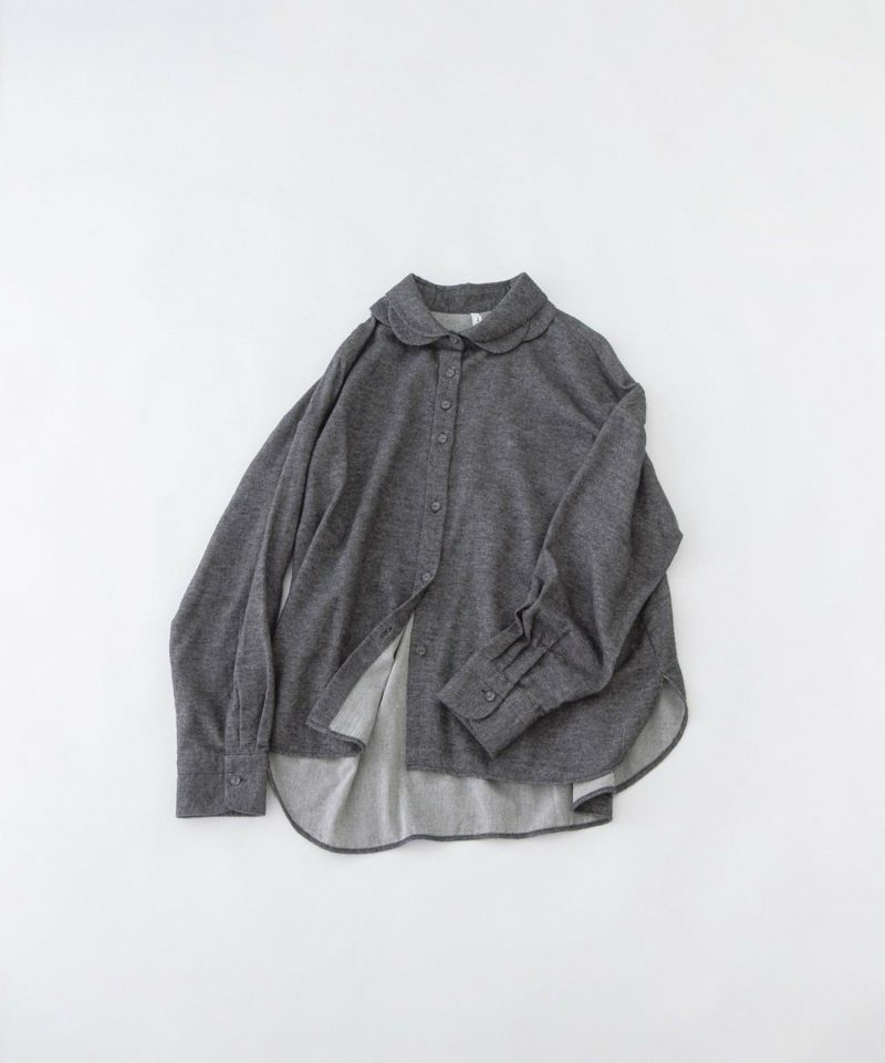 花びらが重なったようなペタルカラーのデザインブラウス。起毛で温かみがある優しくやわらかいビエラ生地で仕立てました。ふっくらと膨らんだノーステッチの前立てで凹凸感を出し、上部だけ細かくボタンを並べました。後ろ裾が長めの前後差デザイン。ボタンはくるみボタン、開けた時にちらりと見える配色ステッチもポイントです。