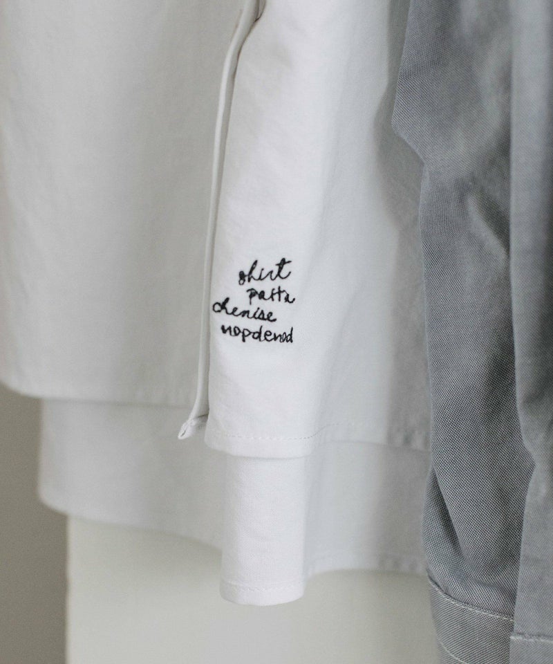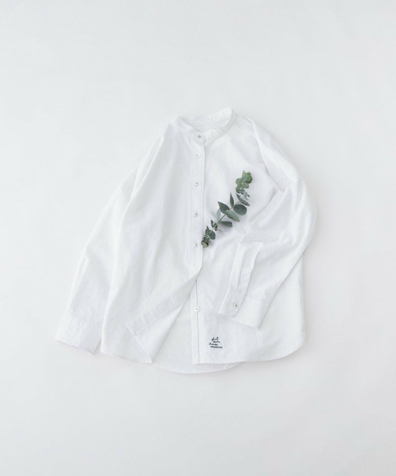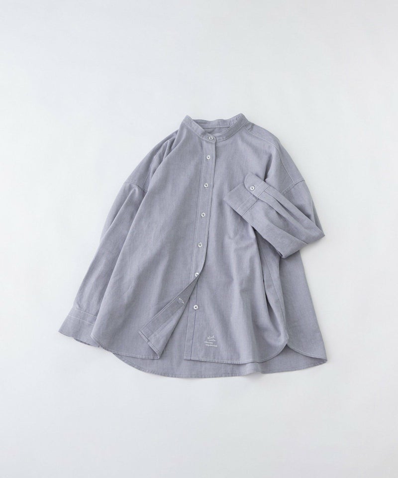 プレッピー気分のオックスフォードのシャツ。やや肉厚でふっくらとした風合いが特徴の生地に、ステッチの効いたバンドカラーと、太目な前立ての正統派なシンプルデザイン。大きすぎないゆったりシルエットで、前裾に入れた文字プリントがアクセント。配色糸で付けたボタンや、開けた時にちらりと見える配色ステッチもさりげないポイントです。