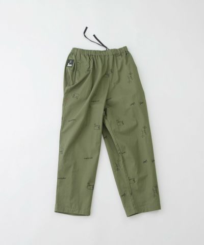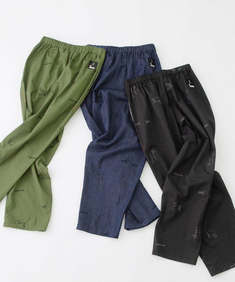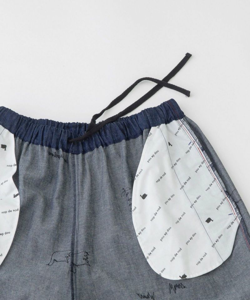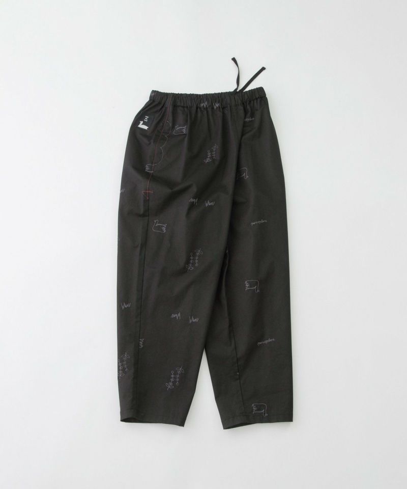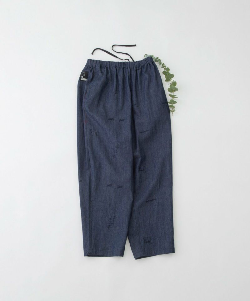 ・甘すぎないラフな線画モチーフで、さりげない刺繍のオリジナル生地で仕立てたパンツ。