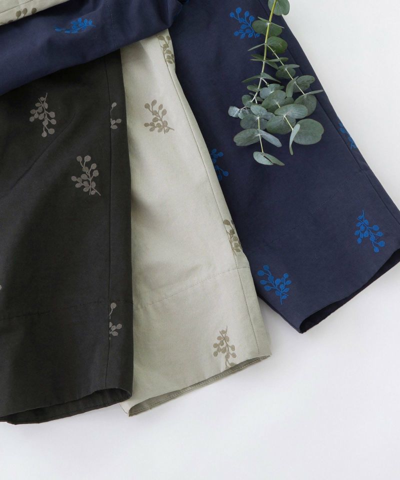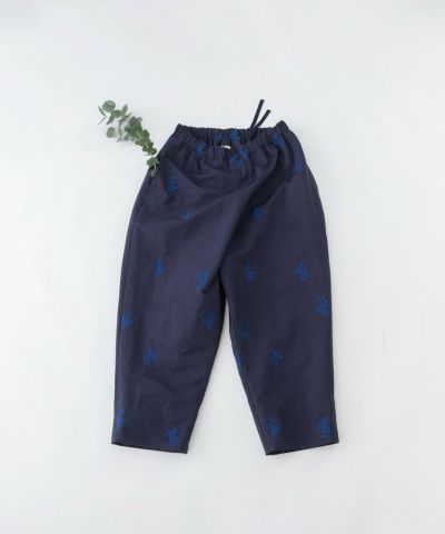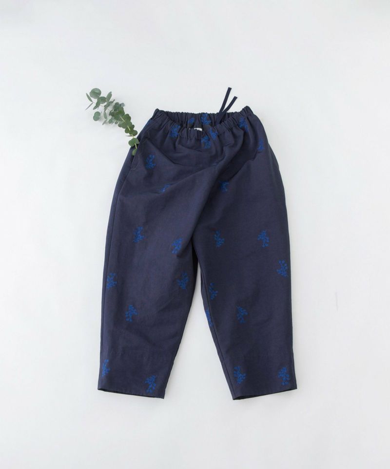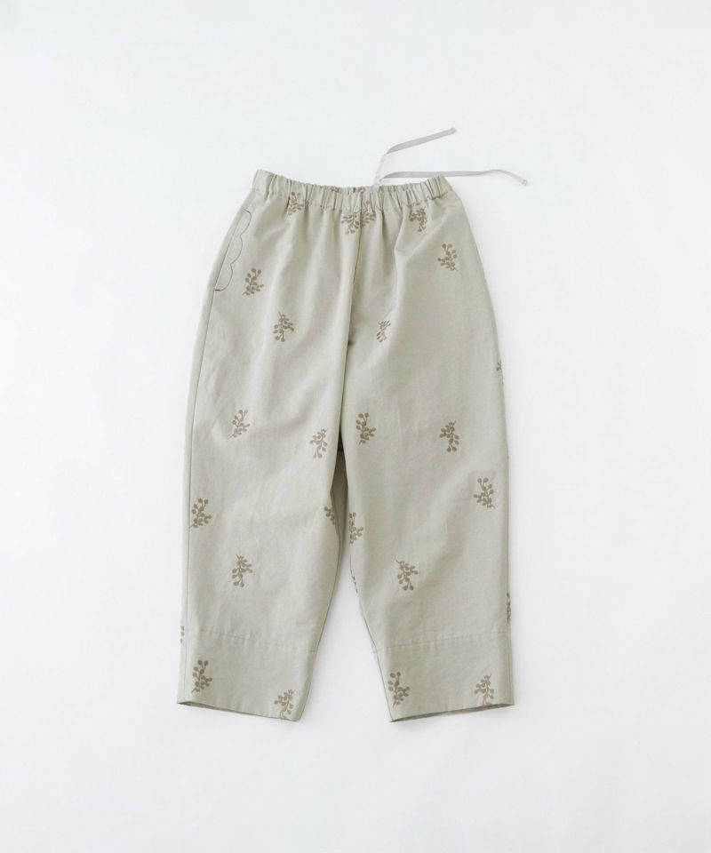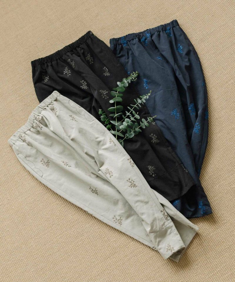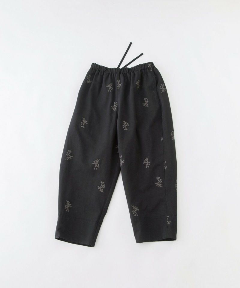 オリジナルのユーカリ刺繍を施したPommeパンツ。股上が深くリラックスしたゆるさと高い位置のボリュームがバランスの良い人気のパンツです。程よい肉感と張りのある生地で、 同系色の刺繍がさりげない存在感でコーディネイトに重宝する1枚。ウエストはゴム仕様で内紐付き。両サイドポケットにはスカラップステッチがさり気なく入っています。