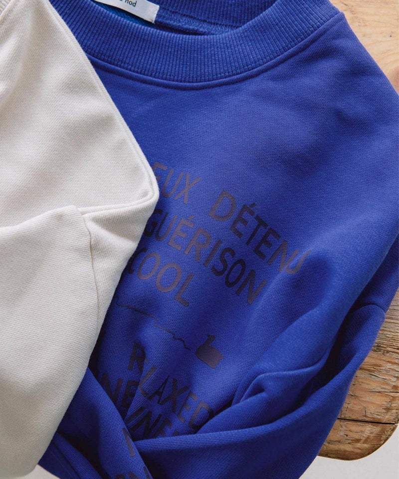 ボディと袖にさりげない配色プリントを入れたトレーナー。ゆったり身巾と長すぎない丈に、袖がやや長めのシルエットです。●ロゴは仏語で「幸せ、ほっこり、 癒される、でもかっこいい」
