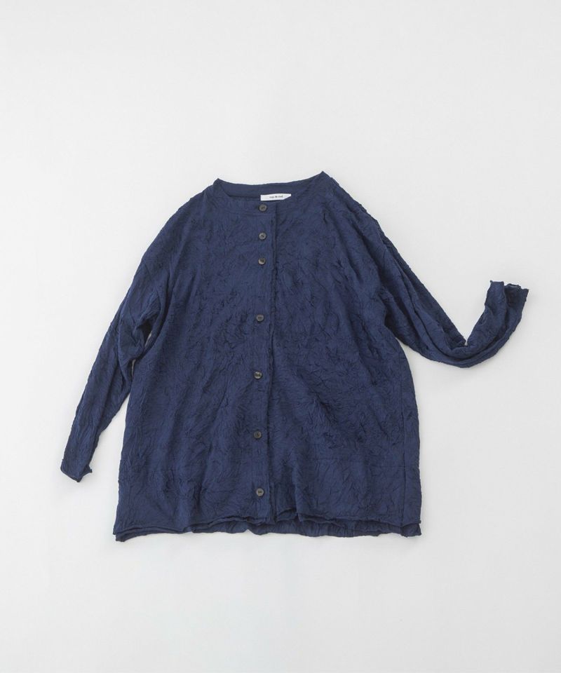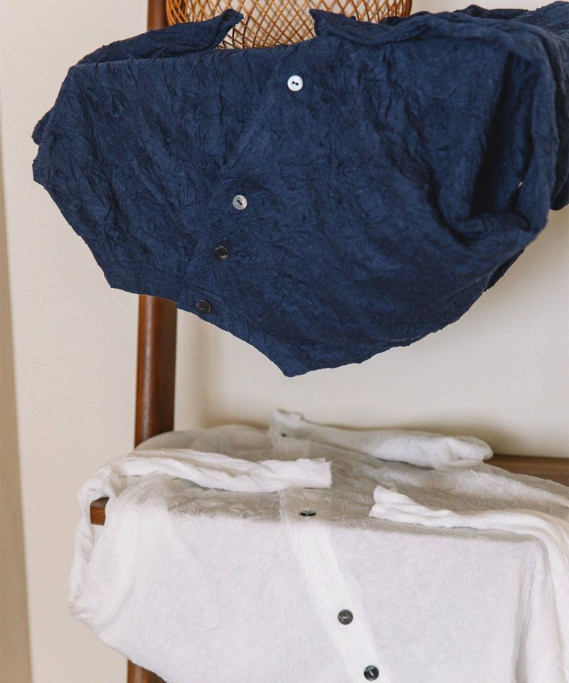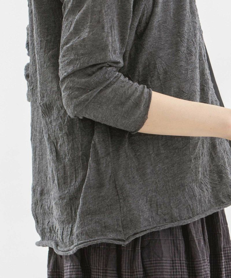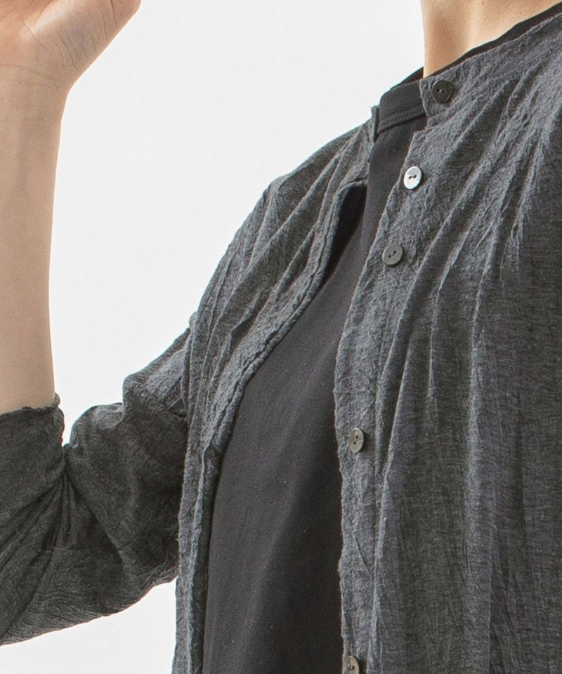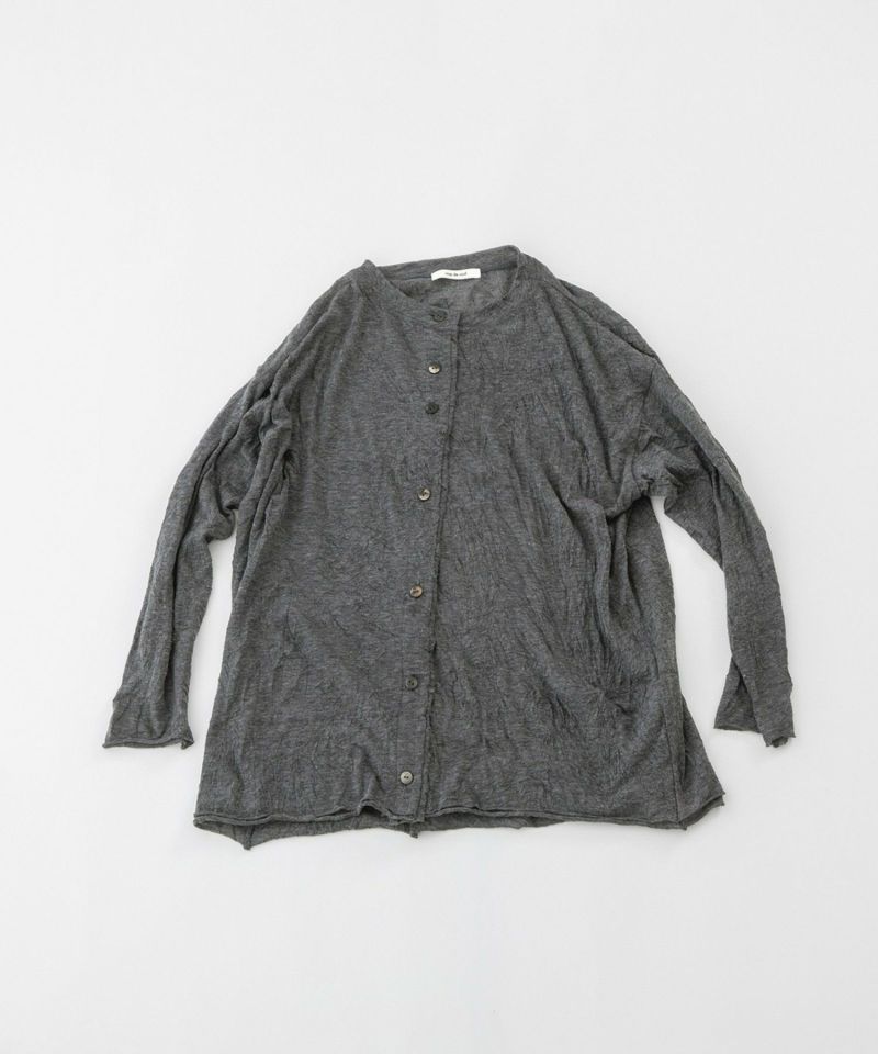 細番手のシワ加工を施した天竺のカーディガン。ナチュラルな質感と柔らかな風合いが特徴です。エアリーでソフトなフィット感に気持ちの良い伸縮とキックバックをプラスした快適さ。軽く嵩張らず、持ち歩きの羽織としてもおすすめです。夏場の冷房対策にも活躍します。