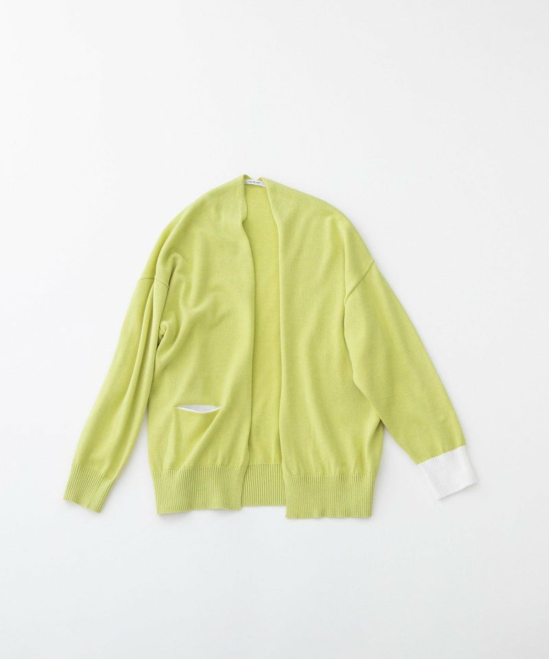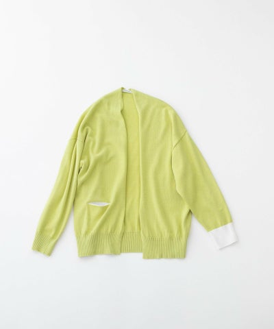オーガニックコットンを使用した肌触りのよいカーディガン。ノーボタンタイプのシンプルデザインで、まだ寒い春先にも軽く羽織れ、秋口までロングシーズン活躍してくれる1枚です。ポケット袋布と左袖リブがさわやかなオフホワイトの配色になっています。