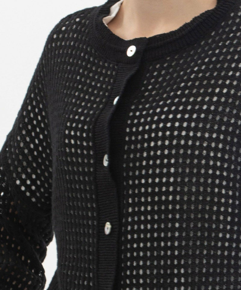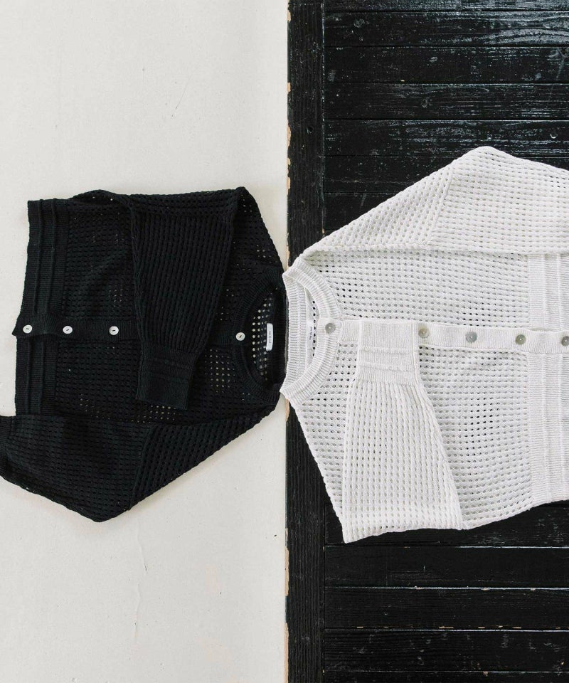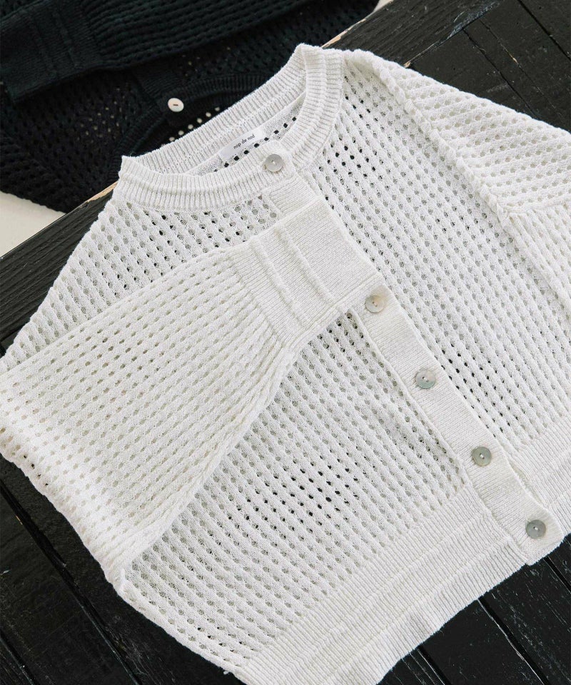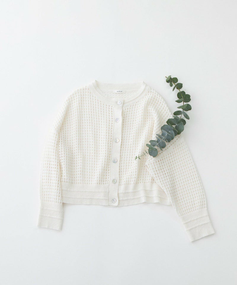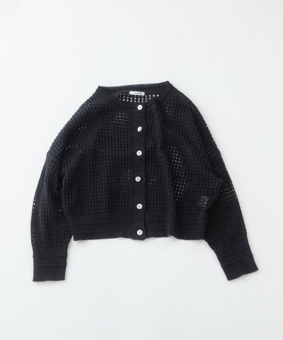 コットンリネンのナチュラルな軽い糸で編み上げたメッシュ編みのカーディガン。暑い夏にもさらっとした肌触りがうれしい。短めの8分袖の今っぽさがあるデザインです。