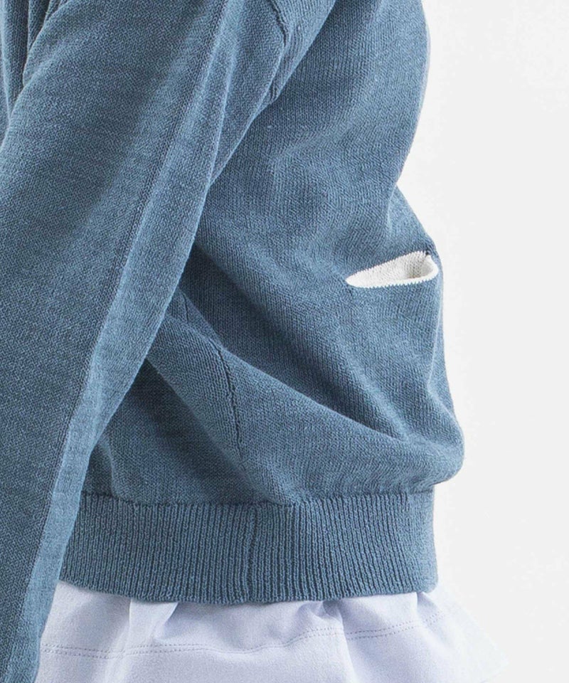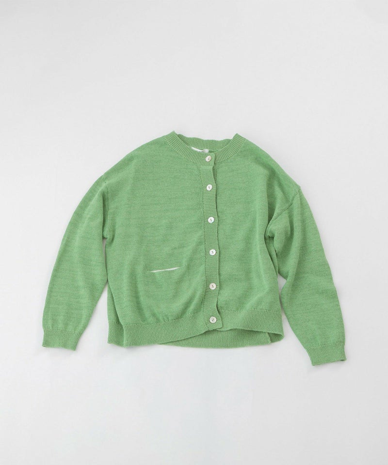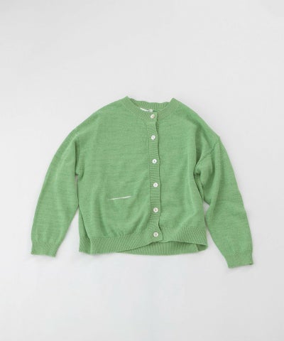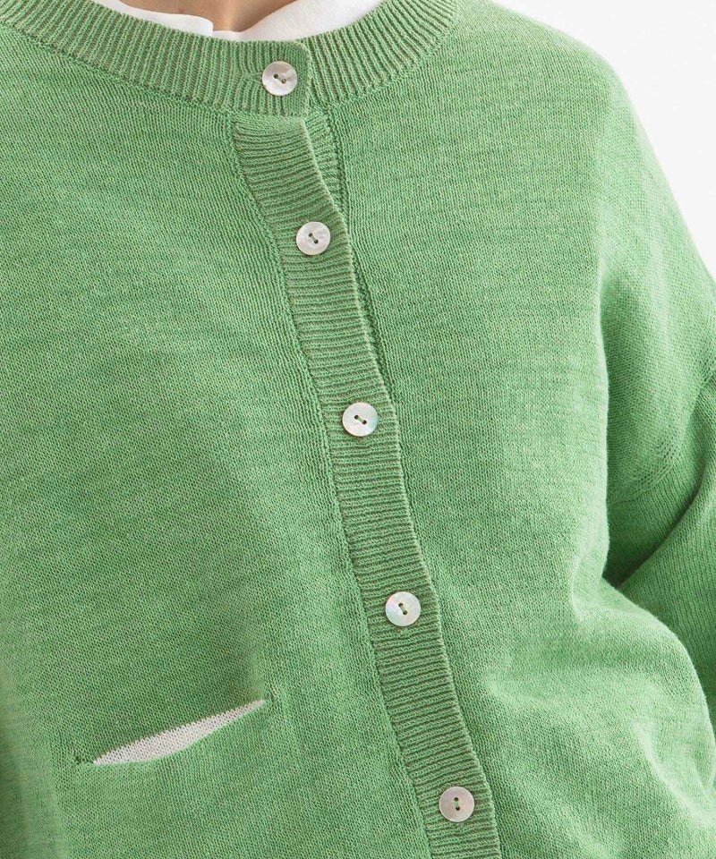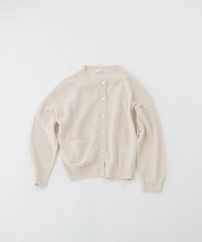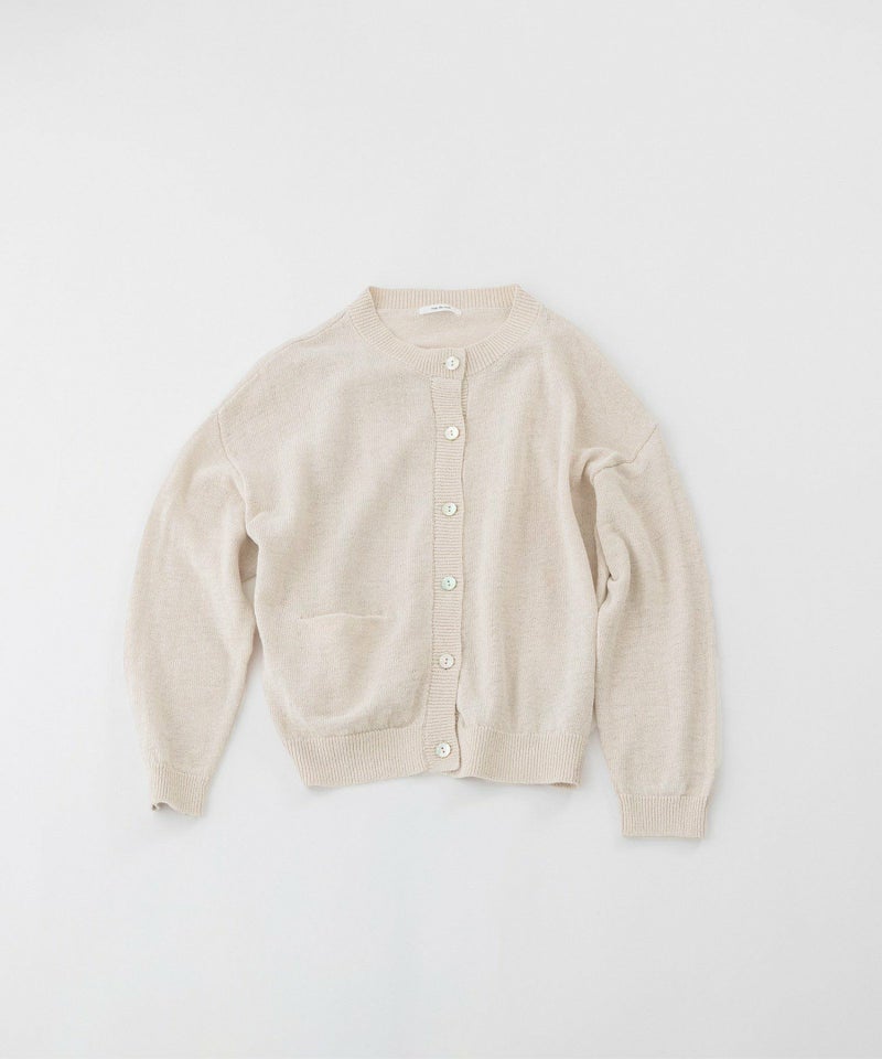 コットンリネンのナチュラルな軽い編み地のクルーカーディガン。ほどよい厚みがあり、ジャケットライクにきちんと見えする1枚です。長袖・ポケット袋布がオフホワイトの配色になっているのがポイントです。