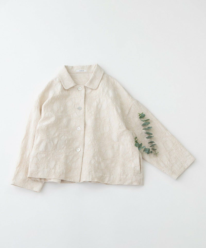 凹凸感のあるコットンリネンのジャカードで仕立てた、きちんと見えする軽いジャケット。ワンピースにも相性のいいショート丈、お袖は7分袖でバランスの良いシルエットです。両サイドポケットつき。