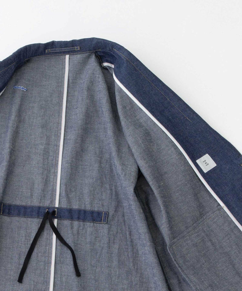 程よい厚みのツイルとコットンリネンデニムのテーラードジャケット。メンズライクなデザインをドロップショルダーでラフに着られます。後ろにワークなドローストリングデザインでアクセンを入れました。袖は長めで、だぼっと着たり、まくったりの着こなしがおすすめです。右後ろ肩あたりにロゴ刺繍が入っています。
