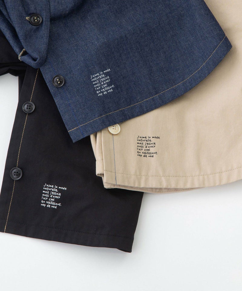 ワイドすぎないシルエットのボトルネックジャケット。程よい厚みのツイルとコットンリネンデニムで展開です。短めの8分袖で、どちらを前にしても着られる前後着用可能な2way仕様です。ラウンドした裾ラインでカジュアルでありながら、きちんと感のある人気のタイプ。ボタン側に入った裾の文字プリントや、開けた時に見える配色ステッチなどさりげないポイントを効かせています。両サイドポケットつき。