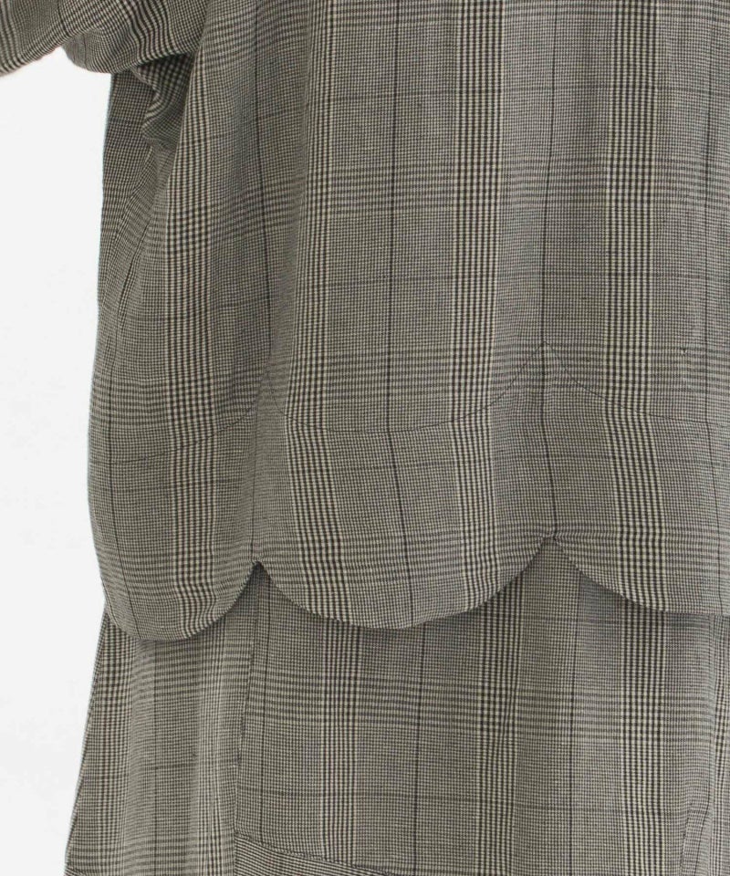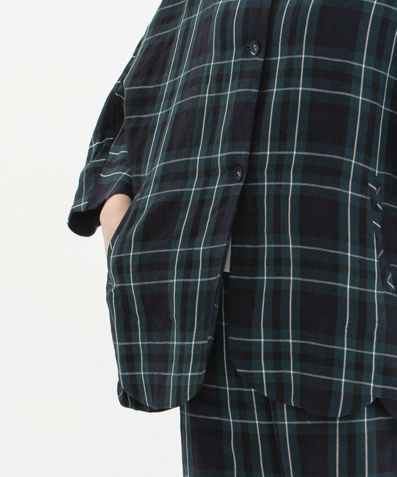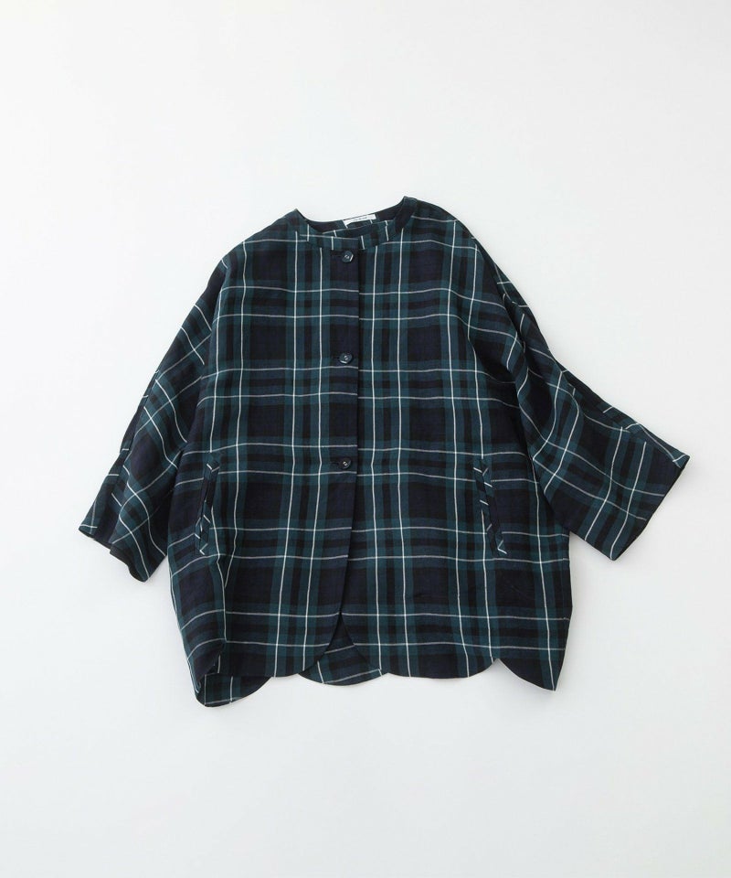 さらっと羽織れるドルマンスリーブのボリュームで大人の抜け感があるジャケット。裾のラインをスカラップにして甘さをプラスしました。素材は張りと落ち感、微光沢があり、カジュアルだけでなくきれいめにも活躍するリネンレーヨン。ブラック、グレンチェック、ブラックウォッチの3色展開です。お袖は8分袖、両サイドポケットつき。
