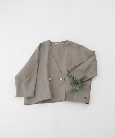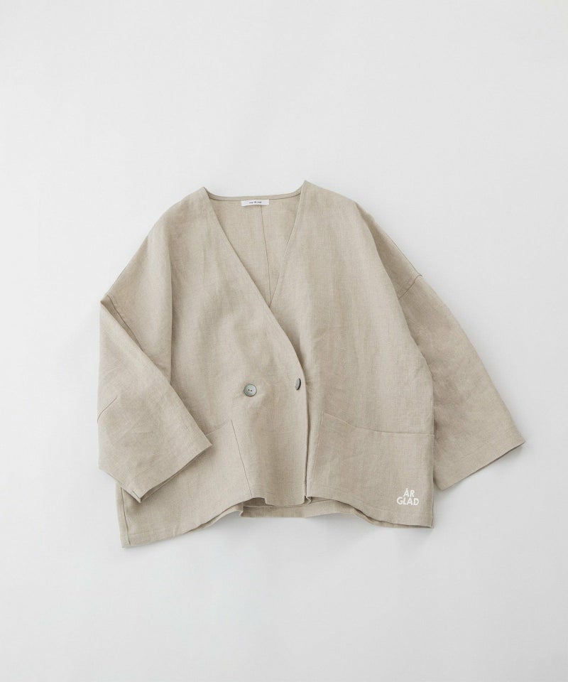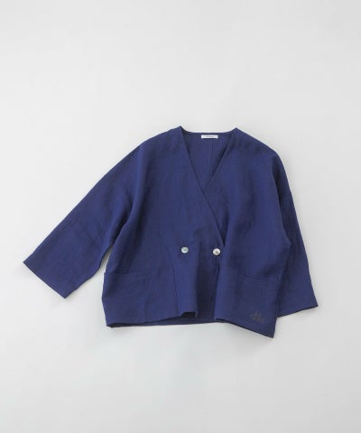 カーディガンのようにさらっと羽織れる軽い1枚仕立てのリネンのジャケット。繰り返し洗うことでくたっと肌に馴染んでくる程よい厚みのあるリネンを使用。四角い平面パターンで着用すると脇が落ちる抜け感があるシルエットで、お袖は7分袖です。両サイドポケットつき。左ポケットに入った文字プリントがポイントになっています。