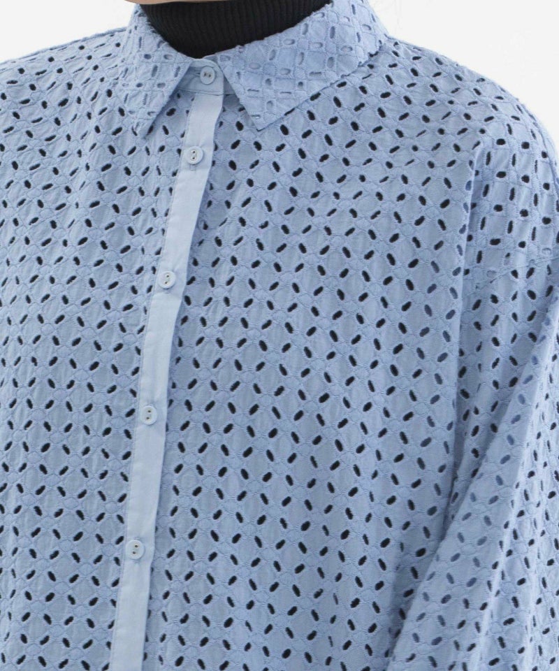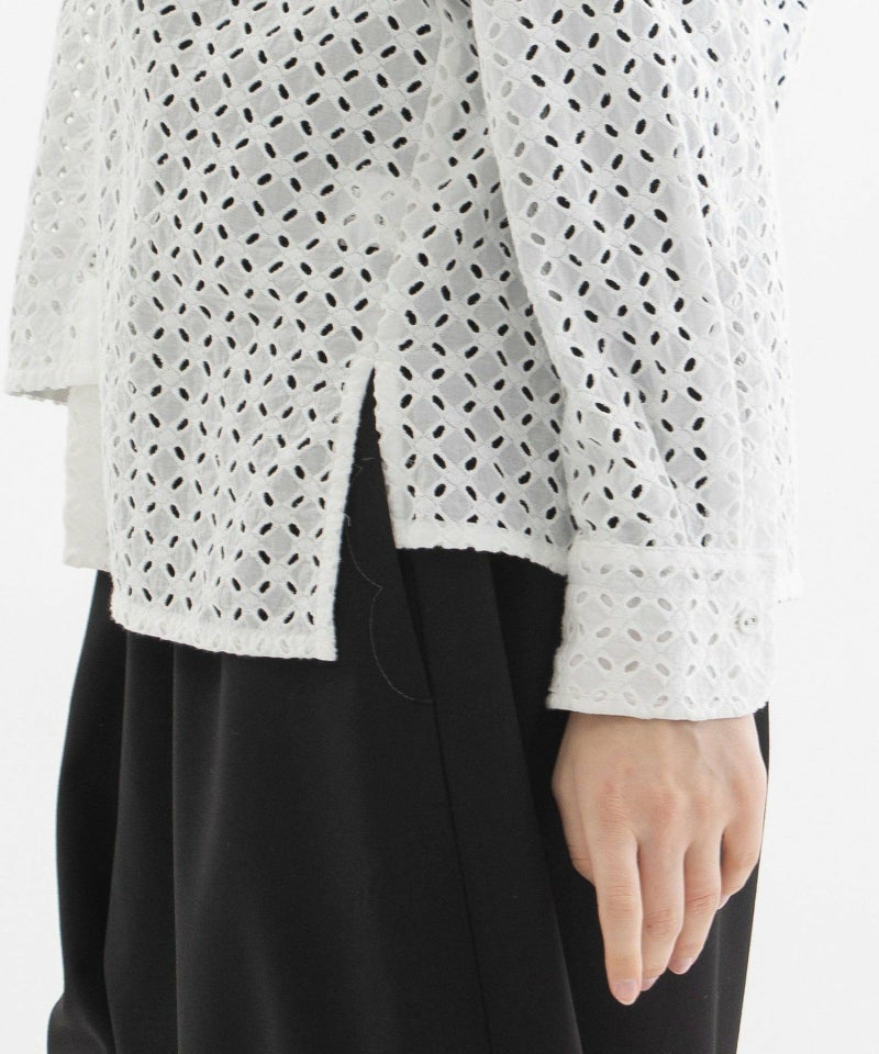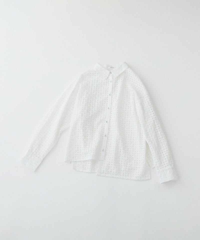 カットソーやニットの上にさらっとあわせるだけで春らしさをプラスできるレースのシャツ。暖かい時期には透け感のある羽織としてもお楽しみ頂けます。前身だけアシンメトリーの裾で、簡単にこなれたレイヤードがかなうデザインシャツ。甘くなりがちなレース生地をマニッシュな型に落とし込むことで、モード感をプラスしています。