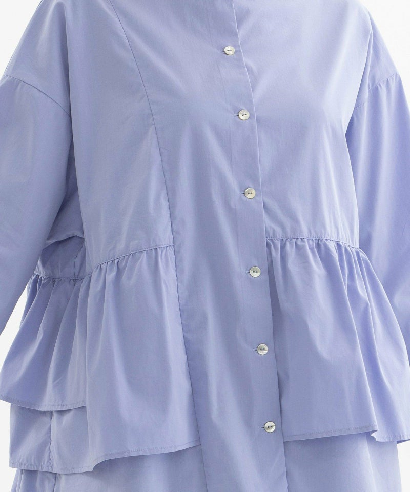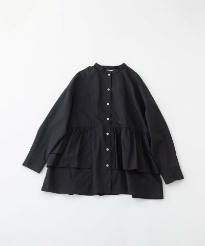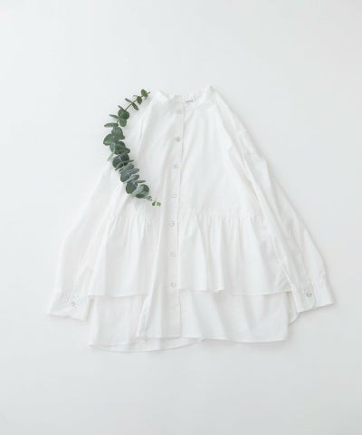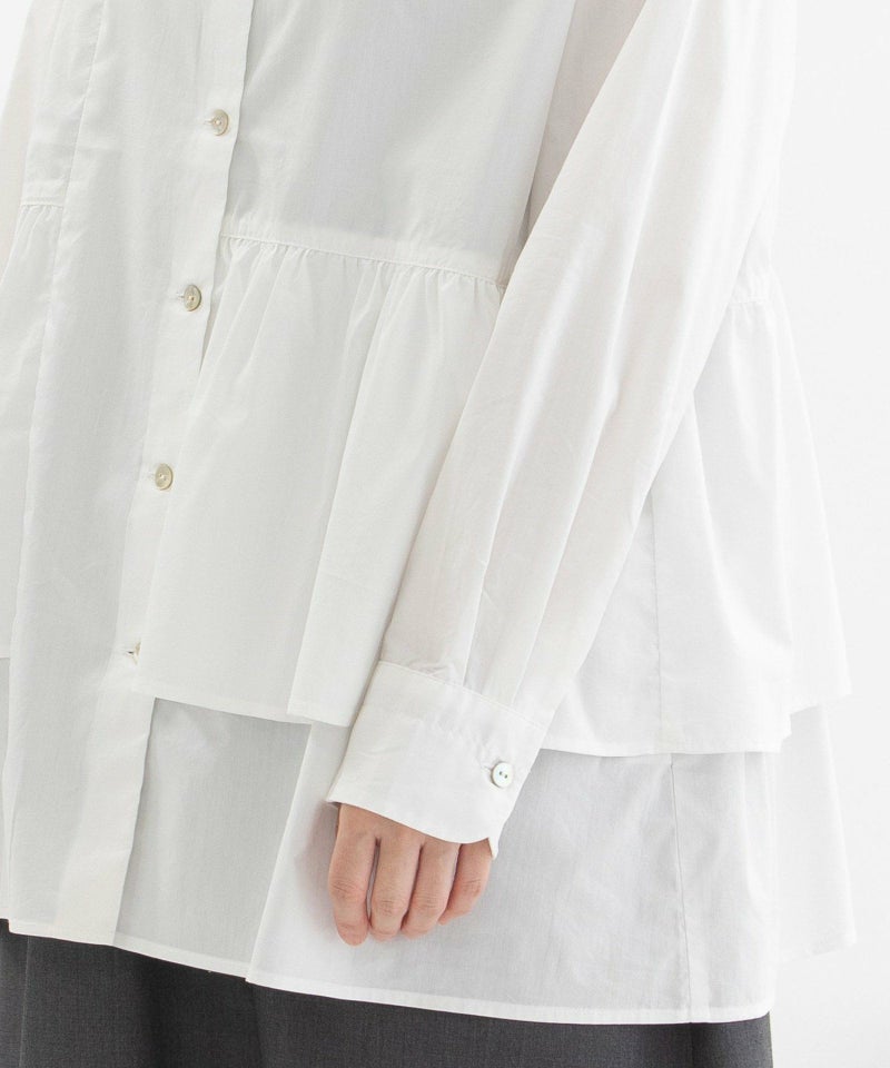 大人に似合う、トレンドのティアードフリルシャツ。アシンメトリーなデザインで甘すぎずモード感をプラスしています。さらっと決まる腰の上あたりまで隠れるチュニック丈で、軽くふわりとフリルが広がるしわになりにくいコットンエステルローンを使用。一枚でトレンド感を楽しめるアイテムです。前ボタンを開けて羽織りとしてもお使い頂けます。