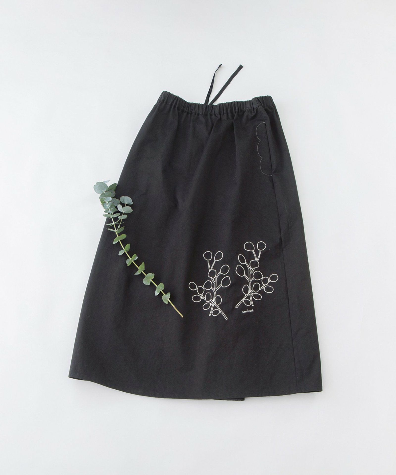 左前と右後ろにユーカリ柄の刺繍をいれたコットンツイルのスカート。後ろ中心にフレアーを入れ、足捌きを良くしながら、フロントは広がりすぎない大人シルエットに仕上げています。ウエストはゴム仕様で内紐付き。両サイドポケットにはスカラップステッチがさり気なく入っています。