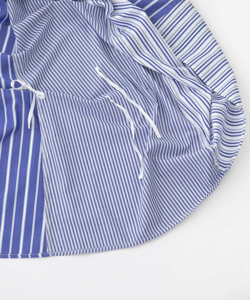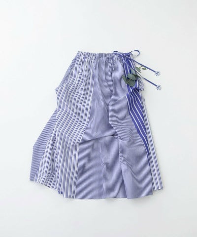 3種の幅違いのストライプを組み合わせたスカート。縦切り替えの流れるようなフレアーギャザーシルエットのマキシ丈で、裏のテープを結ぶことで、ランダムなタックが入ったバルーンシルエットの変形スカートに変身します。フロントは前後どちらでもその日の気分でお楽しみ頂けます。ウエストはゴム仕様で、紐先に付いた六角モチーフもさりげないポイントに。片脇ポケットあり。