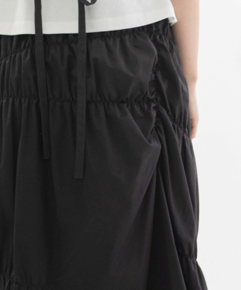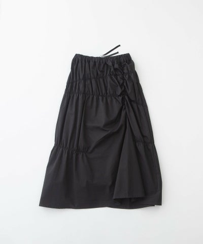 変則的にシャーリングを入れたデザインスカート。程よい厚みのツイルとコットンリネンデニムで展開です。くしゅくしゅとしたシャーリングがマーメードスカート見えするシルエットで、シャーリングの分量も程よくゆるめにして、ボディラインを拾いすぎない縦ラインシルエットに仕上げました。ウエストはゴム仕様です。