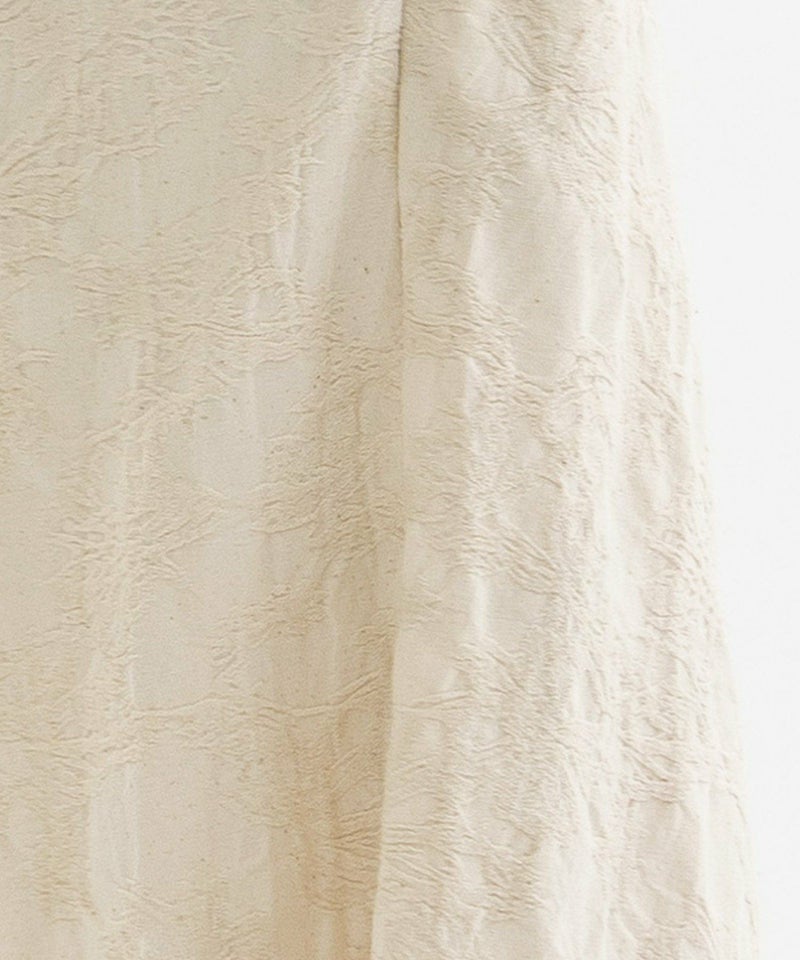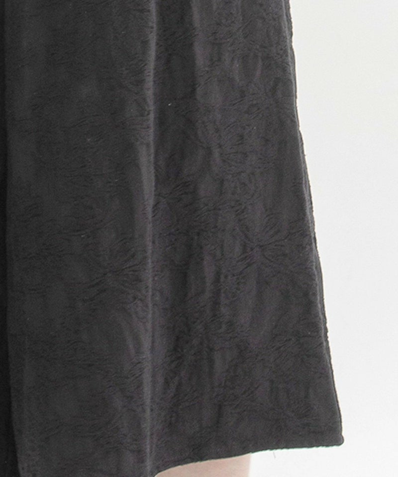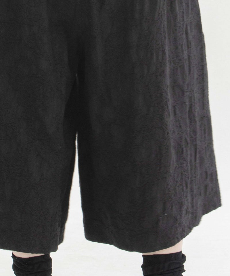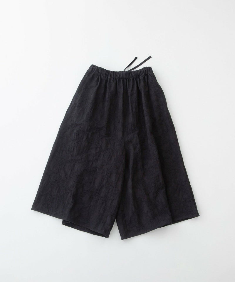 凹凸感のあるコットンリネンのジャカードで仕立てた、きちんと見えするガウチョパンツ。丈が短めすっきりと着られ、深い股がリラックス感もあるシルエットです。ウエストゴム仕様、両サイドにスカラップステッチ入りのポケット付き。